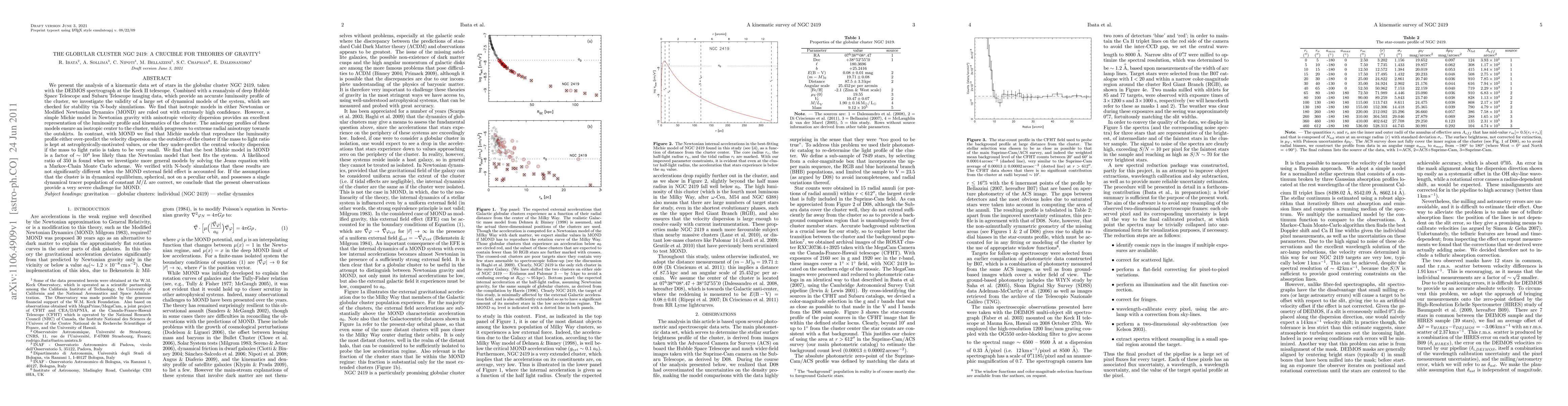 We present the analysis of a kinematic data set of stars in the globular cluster NGC 2419, taken with Keck/DEIMOS. Combined with a reanalysis of deep HST and Subaru imaging data, which provide an accurate luminosity profile of the cluster, we investigate the validity of a large set of dynamical models of the system, which are checked for stability via N-body simulations. We find that isotropic models in either Newtonian or Modified Newtonian Dynamics (MOND) are ruled out with extremely high confidence. However, a simple Michie model in Newtonian gravity with anisotropic velocity dispersion provides an excellent representation of the luminosity profile and kinematics. In contrast, with MOND we find that Michie models that reproduce the luminosity profile either over-predict the velocity dispersion on the outskirts of the cluster if the mass to light ratio is kept at astrophysically-motivated values, or else they under-predict the central velocity dispersion if the mass to light ratio is taken to be very small. We find that the best Michie model in MOND is a factor of 10000 less likely than the Newtonian model that best fits the system. A likelihood ratio of 350 is found when we investigate more general models by solving the Jeans equation with a Markov-Chain Monte Carlo scheme. We verified with N-body simulations that these results are not significantly different when the MOND external field effect is accounted for. If the assumptions that the cluster is in dynamical equilibrium, spherical, not on a peculiar orbit, and possesses a single dynamical tracer population of constant M/L are correct, we conclude that the present observations provide a very severe challenge for MOND. [abridged]
