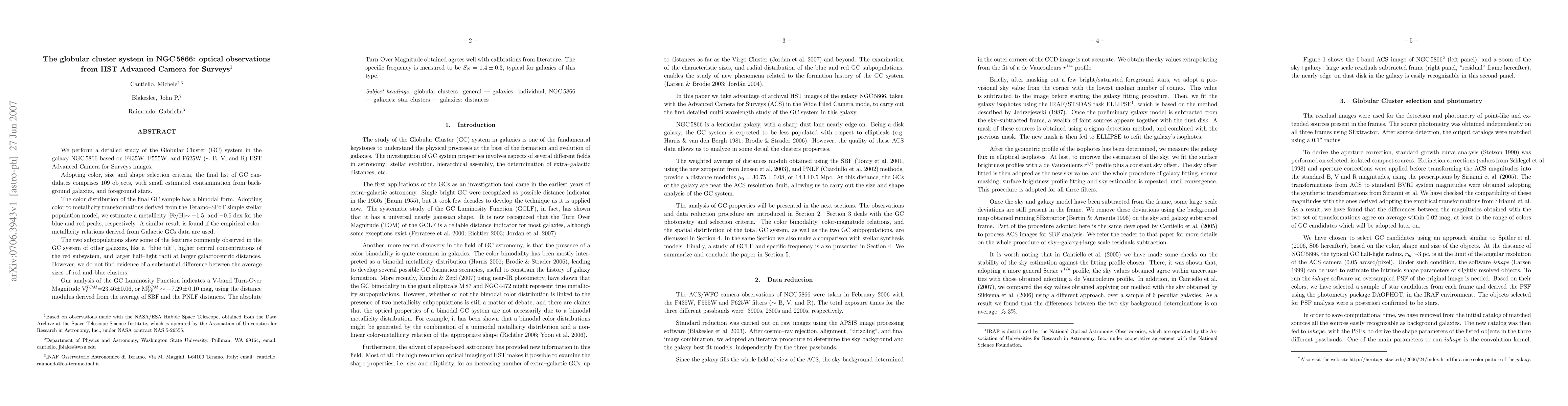 We perform a detailed study of the Globular Cluster (GC) system in the galaxy NGC5866 based on F435W, F555W, and F625W (~ B, V, and R) HST Advanced Camera for Surveys images. Adopting color, size and shape selection criteria, the final list of GC candidates comprises 109 objects, with small estimated contamination from background galaxies, and foreground stars. The color distribution of the final GC sample has a bimodal form. Adopting color to metallicity transformations derived from the Teramo--SPoT simple stellar population model, we estimate a metallicity [Fe/H]~ -1.5, and -0.6 dex for the blue and red peaks, respectively. A similar result is found if the empirical color-metallicity relations derived from Galactic GCs data are used. The two subpopulations show some of the features commonly observed in the GC system of other galaxies, like a ``blue tilt'', higher central concentrations of the red subsystem, and larger half--light radii at larger galactocentric distances. However, we do not find evidence of a substantial difference between the average sizes of red and blue clusters. Our analysis of the GC Luminosity Function indicates a V-band Turn-Over Magnitude V$_0^{TOM}$=23.46+-0.06, or M$_{V,0}^{TOM}\sim-7.29 +- 0.10$ mag, using the distance modulus derived from the average of SBF and the PNLF distances. The absolute Turn-Over Magnitude obtained agrees well with calibrations from literature. The specific frequency is measured to be $S_N=1.4 +- 0.3$, typical for galaxies of this type.