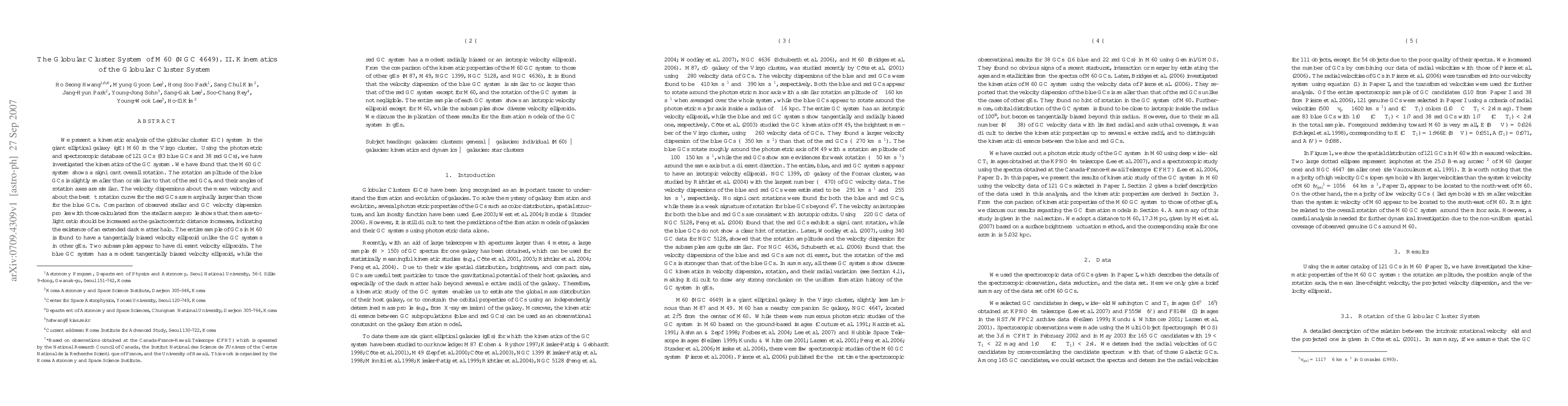 This paper investigates the kinematics of the globular cluster (GC) system in the giant elliptical galaxy M60, revealing significant overall rotation and a tangentially biased velocity ellipsoid. The blue and red GCs exhibit similar rotation axes but differ slightly in rotation amplitude and velocity dispersion, suggesting an extended dark matter halo. The study compares M60's GC system to others in similar galaxies, finding unique kinematic properties that inform models of GC system formation in elliptical galaxies.