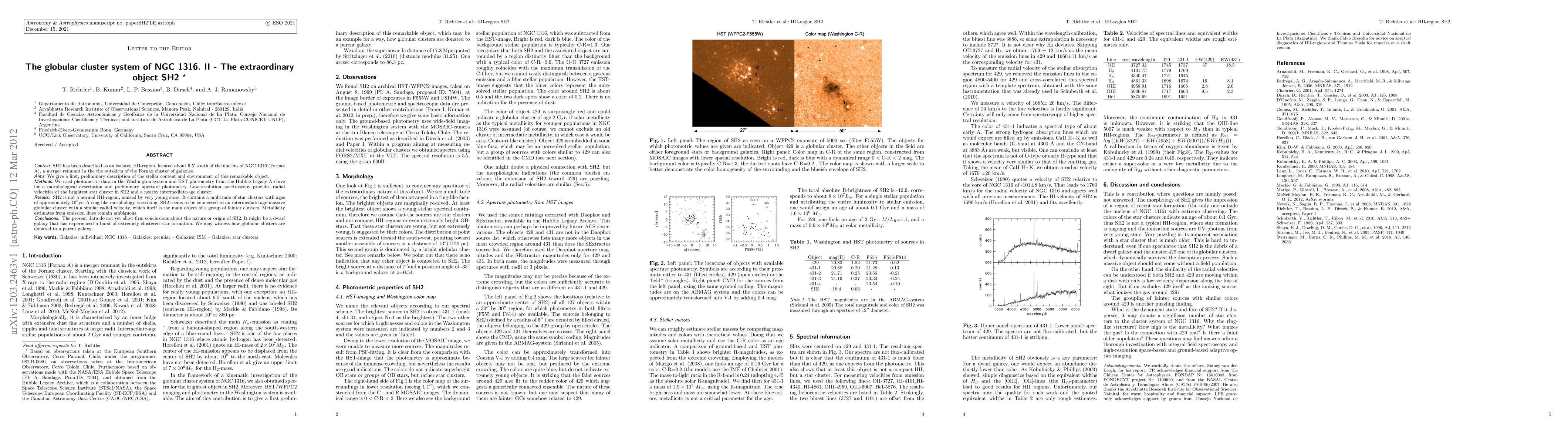 SH2 has been described as an isolated HII-region, located about 6.5 arcmin south of the nucleus of NGC 1316 (Fornax A), a merger remnant in the the outskirts of the Fornax cluster of galaxies. We give a first, preliminary description of the stellar content and environment of this remarkable object. We used photometric data in the Washington system and HST photometry from the Hubble Legacy Archive for a morphological description and preliminary aperture photometry. Low-resolution spectroscopy provides radial velocities of the brightest star cluster in SH2 and a nearby intermediate-age cluster. SH2 is not a normal HII-region, ionized by very young stars. It contains a multitude of star clusters with ages of approximately 0.1 Gyr. A ring-like morphology is striking. SH2 seems to be connected to an intermediate-age massive globular cluster with a similar radial velocity, which itself is the main object of a group of fainter clusters. Metallicity estimates from emission lines remain ambiguous. The present data do not yet allow firm conclusions about the nature or origin of SH2. It might be a dwarf galaxy that has experienced a burst of extremely clustered star formation. We may witness how globular clusters are donated to a parent galaxy.