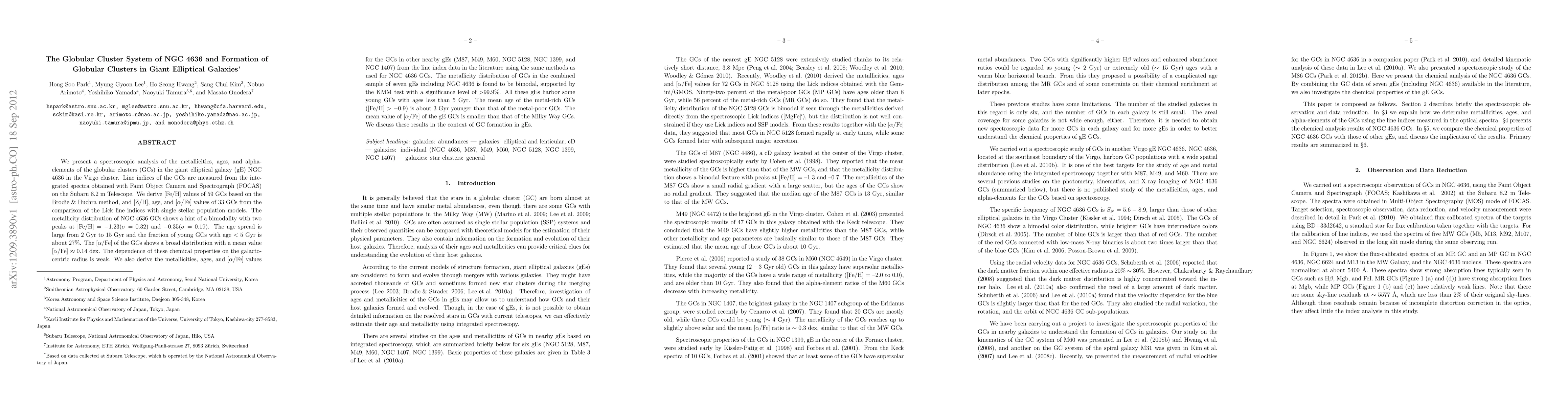 This paper presents a spectroscopic analysis of globular clusters in NGC 4636 and other giant elliptical galaxies, revealing a bimodal metallicity distribution, a large age spread, and a weak dependence of chemical properties on galactocentric radius. The findings suggest that all these galaxies host some young globular clusters and that the formation of globular clusters in giant elliptical galaxies may differ from that in the Milky Way.