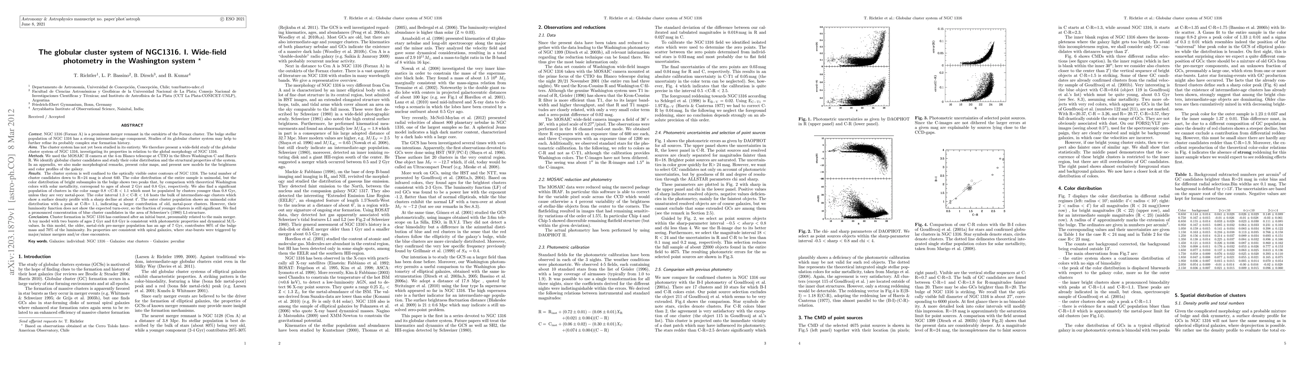This study investigates the globular cluster system of NGC 1316, revealing a unimodal color distribution with distinct age peaks around 2 Gyr and 0.8 Gyr, and a significant population of younger clusters. The clusters are spatially confined to the galaxy's outer contours, indicating ongoing cluster formation post-merger.