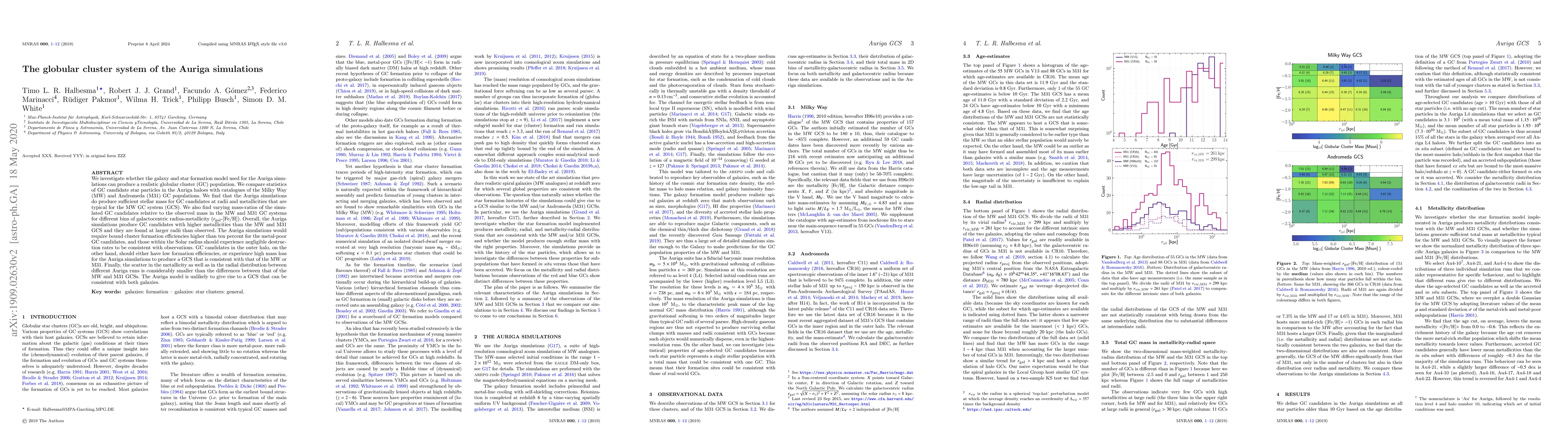 The Auriga simulations generate a globular cluster (GC) population with sufficient stellar mass and typical radii and metallicities, but exhibit higher metallicities and larger radii compared to the Milky Way and Andromeda GC systems. The model requires specific formation efficiencies and low destruction rates for consistency with observations.