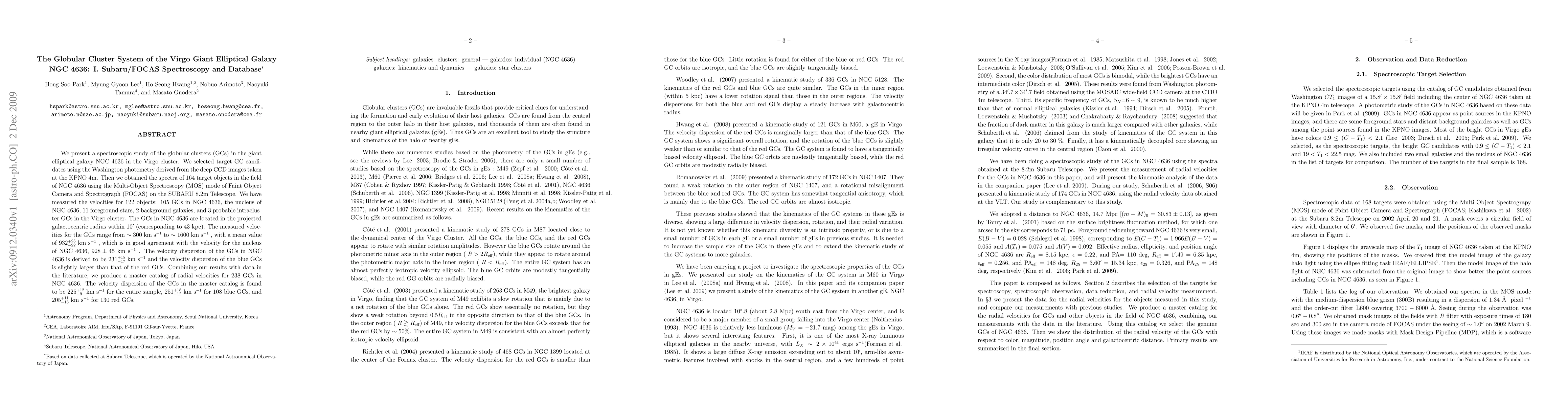 This study uses Subaru/FOCAS spectroscopy to analyze the globular cluster system in NGC 4636, measuring velocities for 122 objects, including 105 GCs. The GCs exhibit a velocity dispersion of 231 km/s, with blue GCs having a slightly larger dispersion than red GCs, and a master catalog of 238 GCs is compiled.