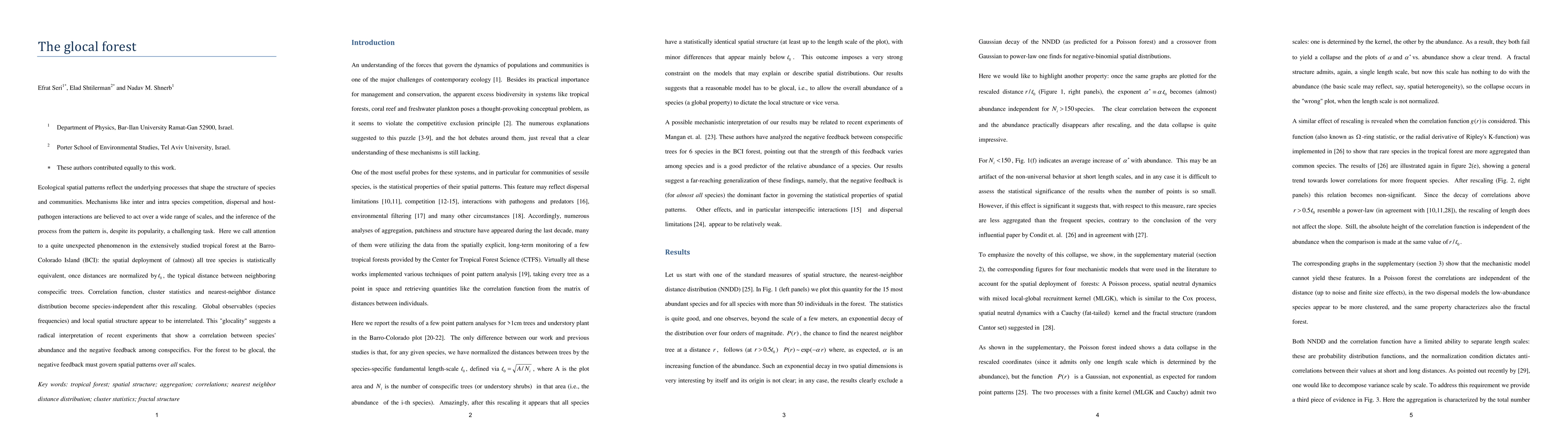 Ecological spatial patterns reflect the underlying processes that shape the structure of species and communities. Mechanisms like inter and intra species competition, dispersal and host-pathogen interactions are believed to act over a wide range of scales, and the inference of the process from the pattern is, despite its popularity, a challenging task. Here we call attention to a quite unexpected phenomenon in the extensively studied tropical forest at the Barro-Colorado Island (BCI): the spatial deployment of (almost) all tree species is statistically equivalent, once distances are normalized by , the typical distance between neighboring conspecific trees. Correlation function, cluster statistics and nearest-neighbor distance distribution become species-independent after this rescaling. Global observables (species frequencies) and local spatial structure appear to be interrelated. This "glocality" suggests a radical interpretation of recent experiments that show a correlation between species' abundance and the negative feedback among conspecifics. For the forest to be glocal, the negative feedback must govern spatial patterns over all scales.