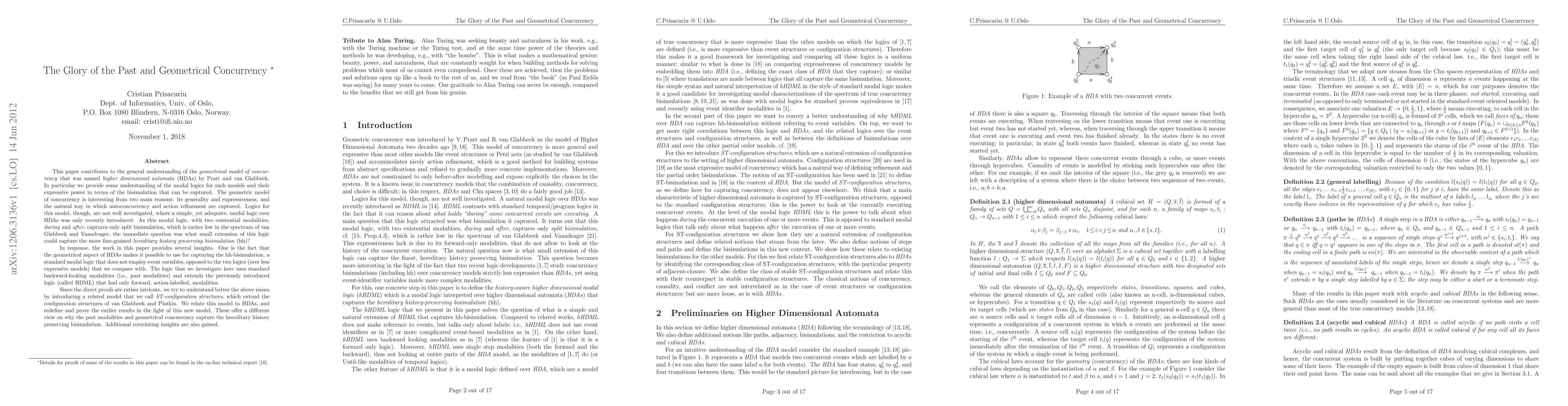 This paper contributes to the general understanding of the geometrical model of concurrency that was named higher dimensional automata (HDAs) by Pratt. In particular we investigate modal logics for such models and their expressive power in terms of the bisimulation that can be captured. The geometric model of concurrency is interesting from two main reasons: its generality and expressiveness, and the natural way in which autoconcurrency and action refinement are captured. Logics for this model, though, are not well investigated, where a simple, yet adequate, modal logic over HDAs was only recently introduced. As this modal logic, with two existential modalities, during and after, captures only split bisimulation, which is rather low in the spectrum of van Glabbeek and Vaandrager, the immediate question was what small extension of this logic could capture the more fine-grained hereditary history preserving bisimulation (hh)? In response, the work in this paper provides several insights. One is the fact that the geometrical aspect of HDAs makes it possible to use for capturing the hh-bisimulation, a standard modal logic that does not employ event variables, opposed to the two logics (over less expressive models) that we compare with. The logic that we investigate here uses standard past modalities and extends the previously introduced logic (called HDML) that had only forward, action-labelled, modalities. Besides, we try to understand better the above issues by introducing a related model that we call ST-configuration structures, which extend the configuration structures of van Glabbeek and Plotkin. We relate this model to HDAs, and redefine and prove the earlier results in the light of this new model. These offer a different view on why the past modalities and geometrical concurrency capture the hereditary history preserving bisimulation. Additional correlating insights are also gained.
