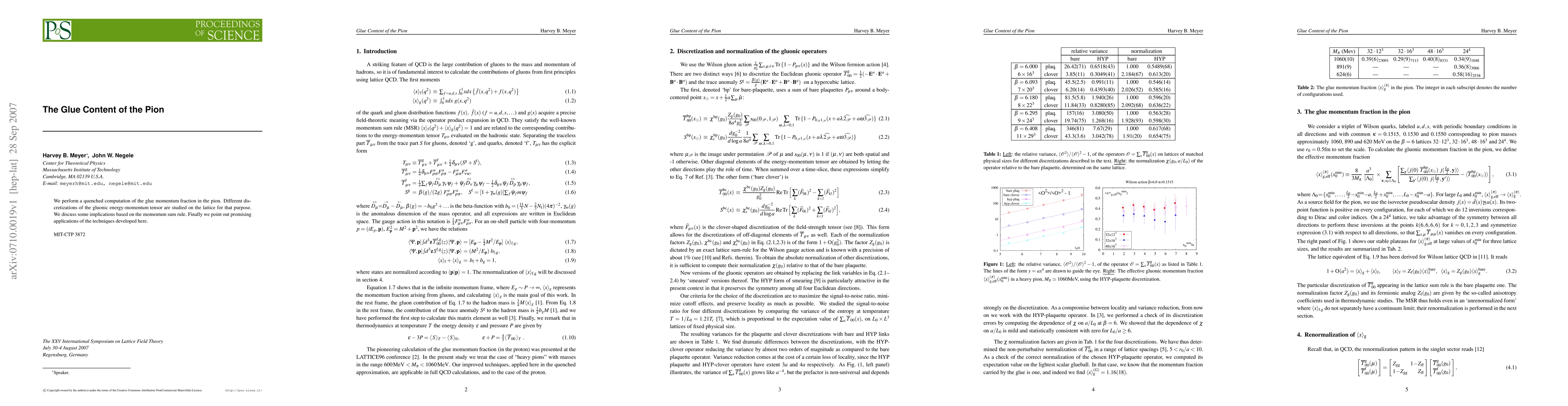 We perform a quenched computation of the glue momentum fraction in the pion. Different discretizations of the gluonic energy-momentum tensor are studied on the lattice for that purpose. We discuss some implications based on the momentum sum rule. Finally we point out promising applications of the techniques developed here.