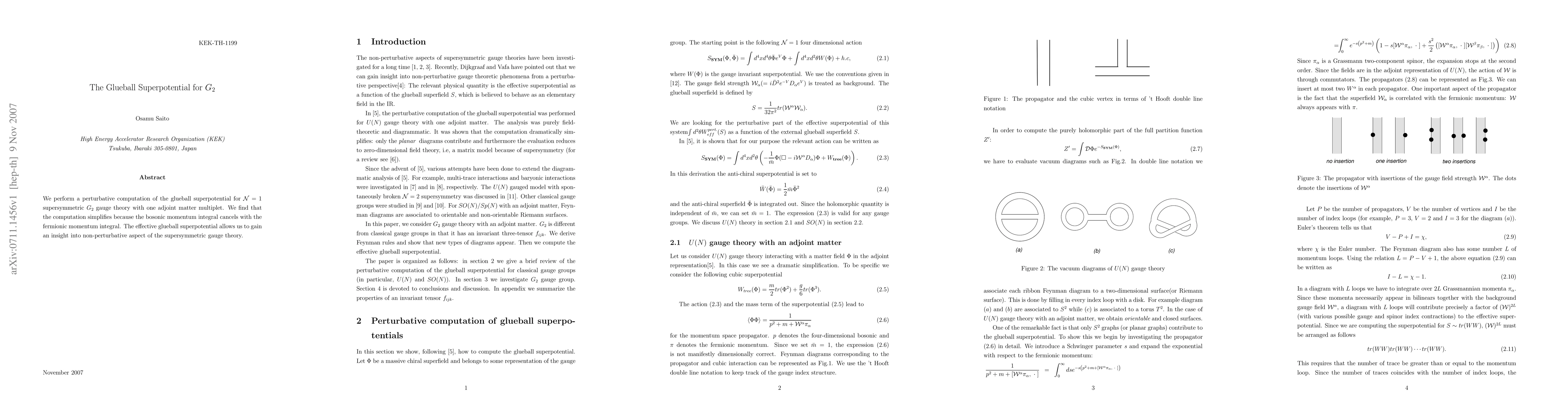 We perform a perturbative computation of the glueball superpotential for N=1 supersymmetric G_2 gauge theory with one adjoint matter multiplet. We find that the computation simplifies because the bosonic momentum integral cancels with the fermionic momentum integral. The effective glueball superpotential allows us to gain an insight into non-perturbative aspect of the supersymetric gauge theory.
