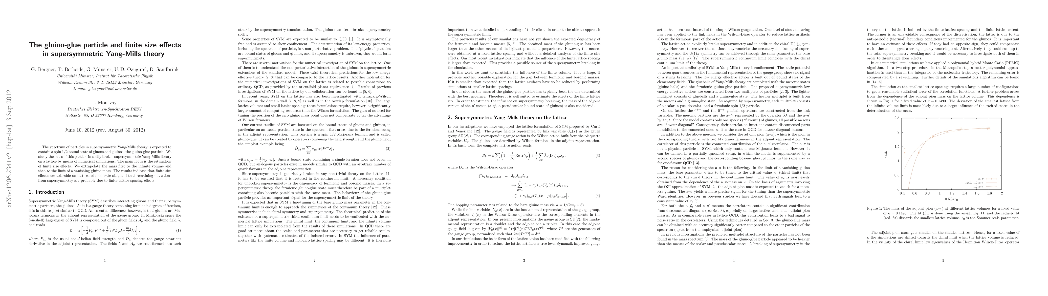 Summary: This paper investigates the mass of a spin 1/2 bound state of gluons and gluinos, termed the gluino-glue particle, in supersymmetric Yang-Mills theory via lattice simulations. It finds that finite size effects are manageable on moderate-sized lattices, with deviations from supersymmetry likely due to finite lattice spacing effects.