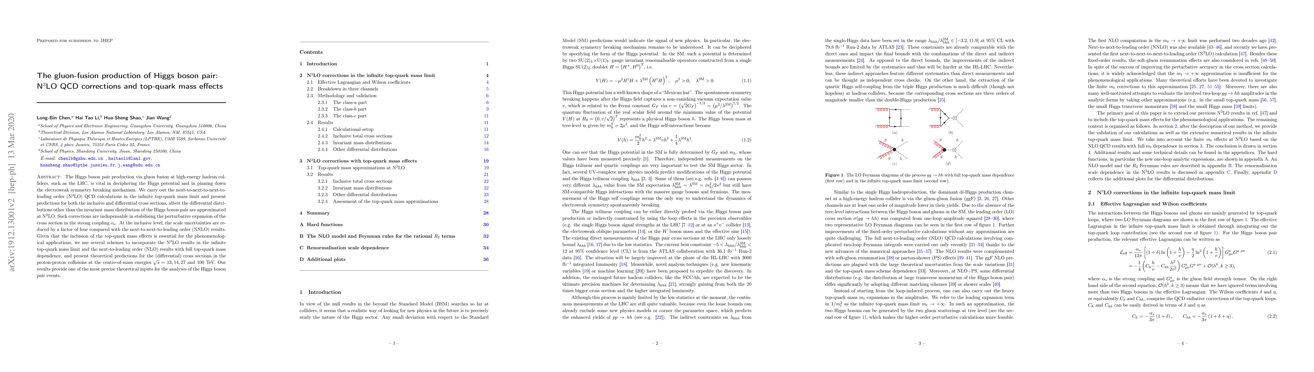 The Higgs boson pair production via gluon fusion at high-energy hadron colliders, such as the LHC, is vital in deciphering the Higgs potential and in pinning down the electroweak symmetry breaking mechanism. We carry out the next-to-next-to-next-to-leading order (N$^3$LO) QCD calculations in the infinite top-quark mass limit and present predictions for both the inclusive and differential cross sections, albeit the differential distributions other than the invariant mass distribution of the Higgs boson pair are approximated at N$^3$LO. Such corrections are indispensable in stabilising the perturbative expansion of the cross section in the strong coupling $\alpha_s$. At the inclusive level, the scale uncertainties are reduced by a factor of four compared with the next-to-next-to-leading order (NNLO) results. Given that the inclusion of the top-quark mass effects is essential for the phenomenological applications, we use several schemes to incorporate the N$^3$LO results in the infinite top-quark mass limit and the next-to-leading order (NLO) results with full top-quark mass dependence, and present theoretical predictions for the (differential) cross sections in the proton-proton collisions at the centre-of-mass energies $\sqrt{s}=13,14,27$ and $100$ TeV. Our results provide one of the most precise theoretical inputs for the analyses of the Higgs boson pair events.