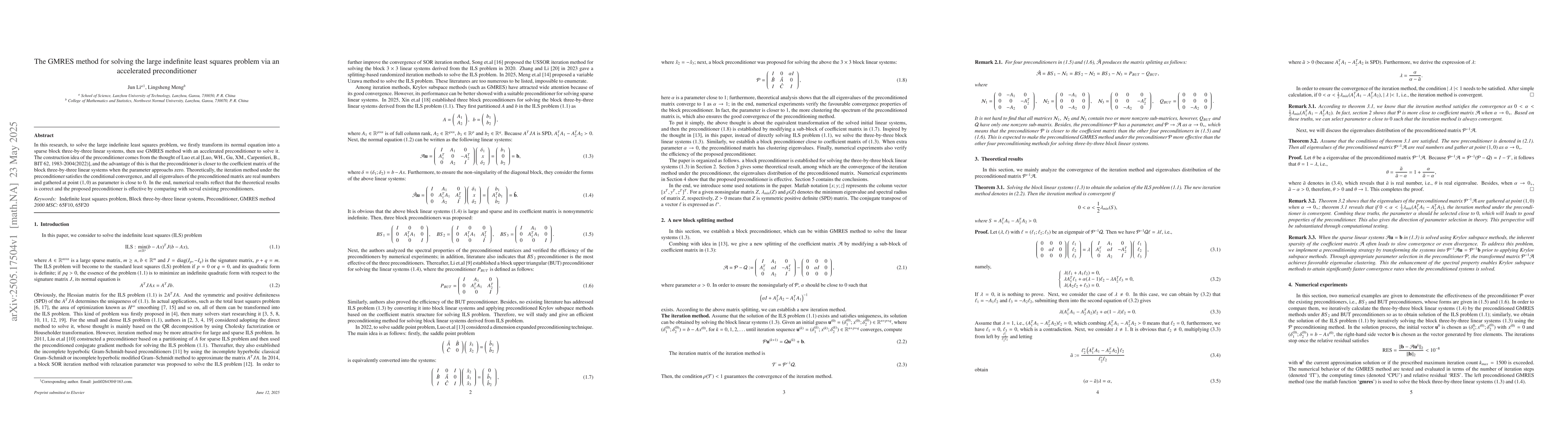 This research paper presents a new method for solving large indefinite least squares problems using GMRES with an accelerated preconditioner. It demonstrates the effectiveness of the proposed preconditioner through numerical results compared to existing methods.