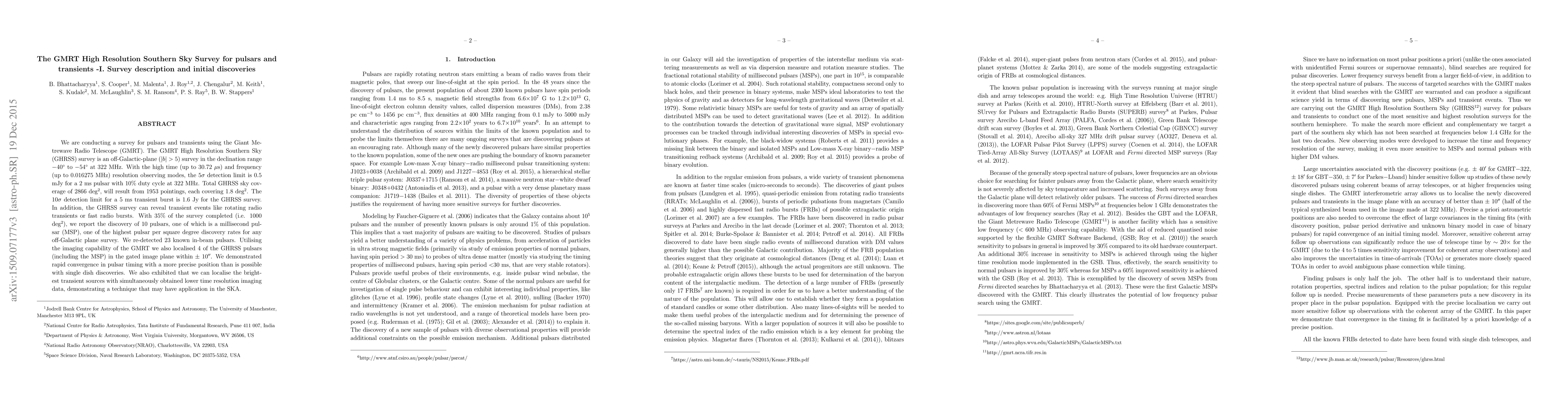 The GMRT High Resolution Southern Sky Survey (GHRSS) aims to detect pulsars and transients using the Giant Metrewave Radio Telescope. Initial results from 35% of the survey reveal 10 pulsars, including a millisecond pulsar, and 23 known pulsars, with high precision localization and rapid timing convergence.