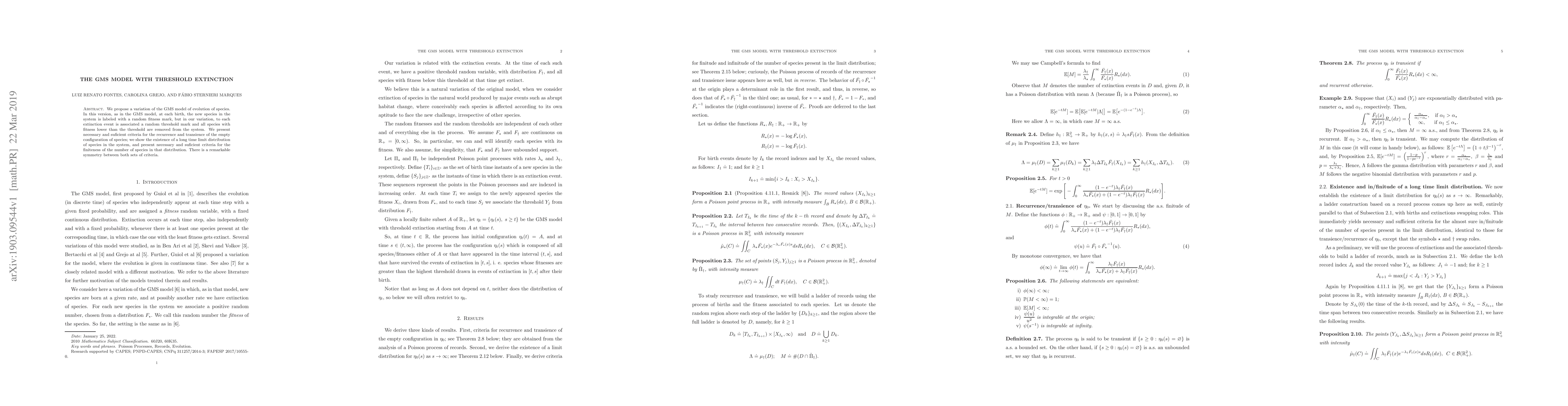 This paper proposes a variation of the GMS model, introducing a threshold extinction event that removes species with low fitness, and derives conditions for its long-term behavior.