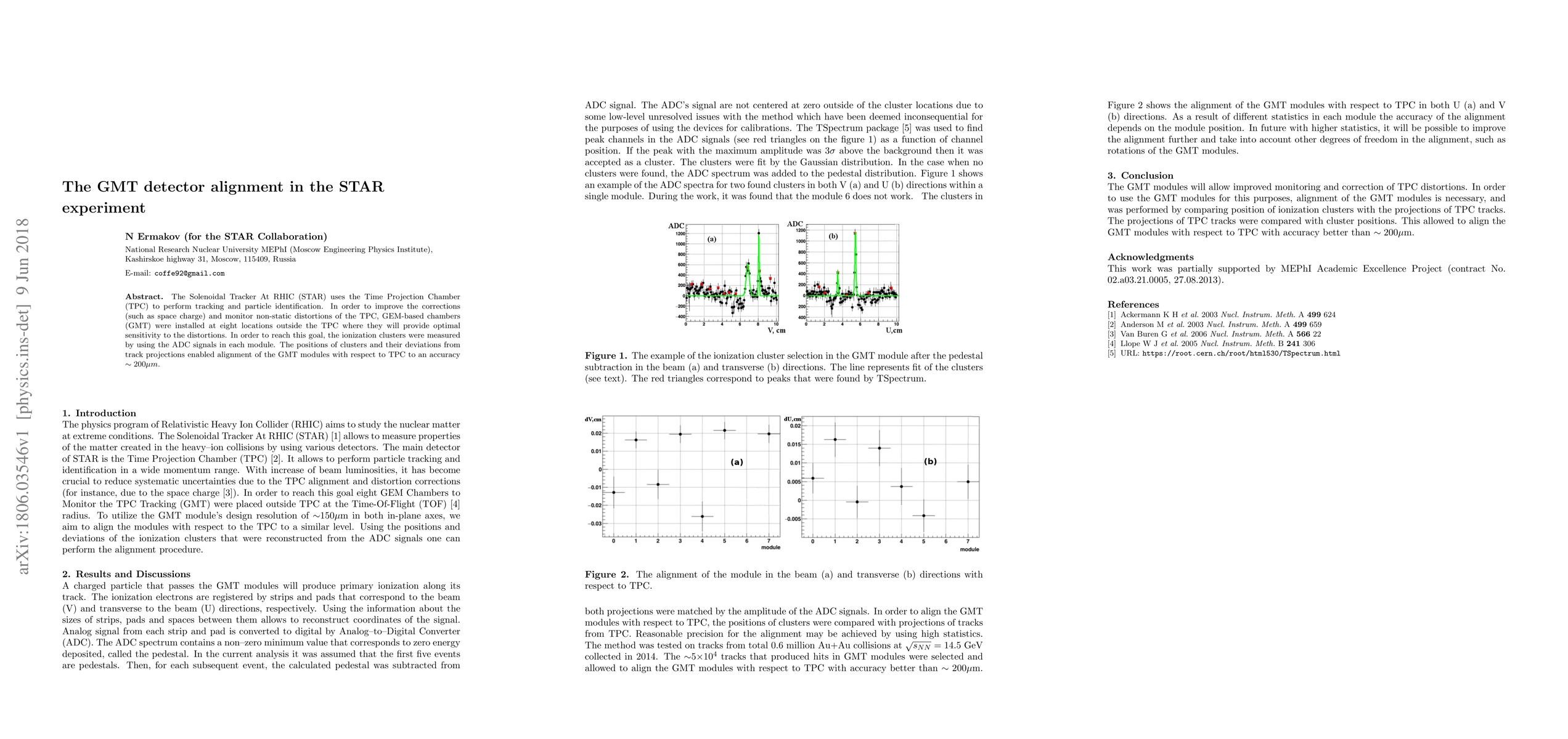 The Solenoidal Tracker At RHIC (STAR) uses the Time Projection Chamber (TPC) to perform tracking and particle identification. In order to improve the corrections (such as space charge) and monitor non-static distortions of the TPC, GEM-based chambers (GMT) were installed at eight locations outside the TPC where they will provide optimal sensitivity to the distortions. In order to reach this goal, the ionization clusters were measured by using the ADC signals in each module. The positions of clusters and their deviations from track projections enabled alignment of the GMT modules with respect to TPC to an accuracy ~ 200{\mu}m.