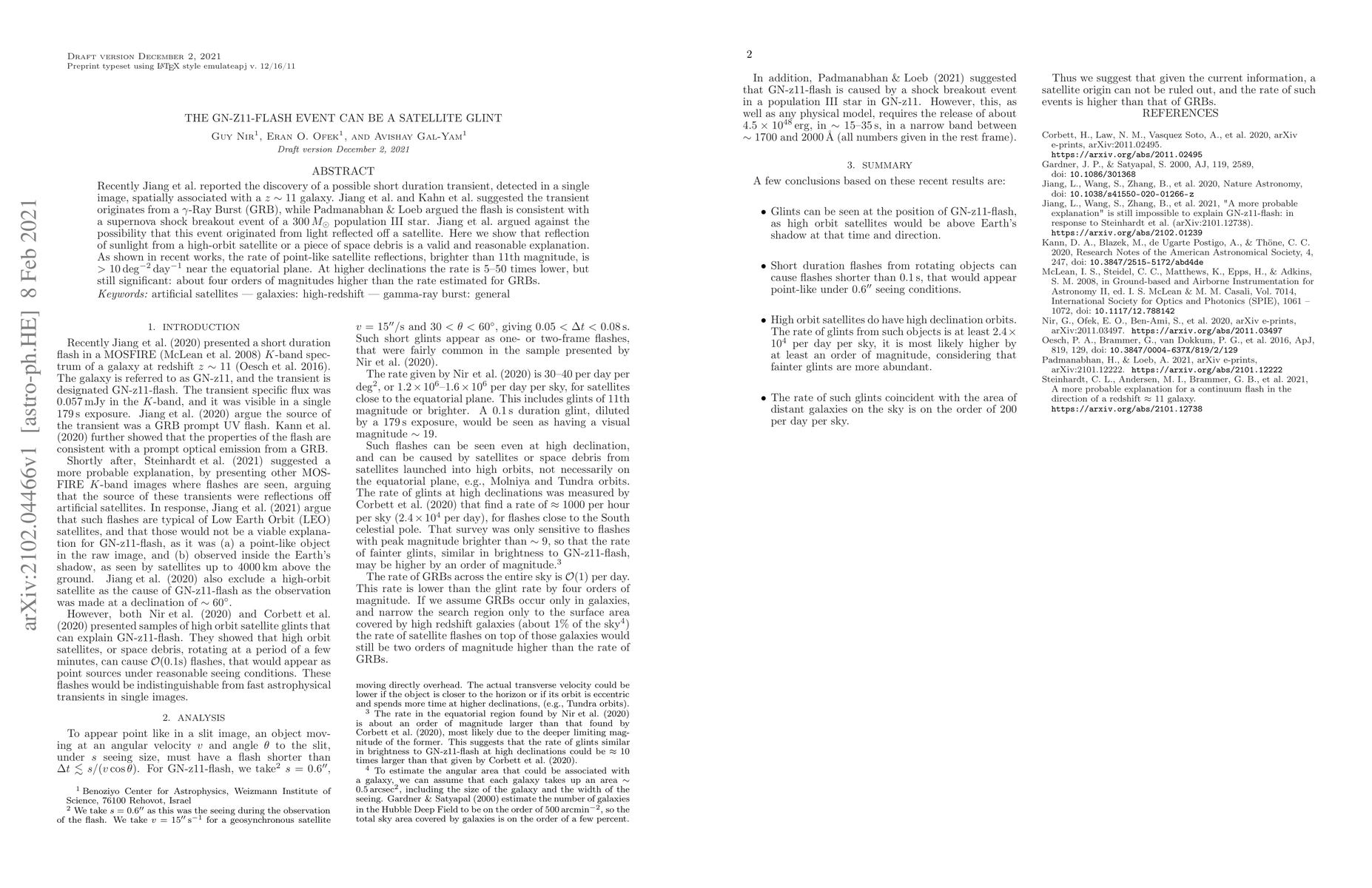 Recently Jiang et al. reported the discovery of a possible short duration transient, detected in a single image, spatially associated with a z~11 galaxy. Jiang et al. and Kahn et al. suggested the transient originates from a Gamma-Ray Burst (GRB), while Padmanabhan & Loeb argued the flash is consistent with a supernova shock breakout event of a 300 M_sun population III star. Jiang et al. argued against the possibility that this event originated from light reflected off a satellite. Here we show that reflection of sunlight from a high-orbit satellite or a piece of space debris is a valid and reasonable explanation. As shown in recent works, the rate of point-like satellite reflections, brighter than 11th magnitude, is >10 deg^{-2} day^-1 near the equatorial plane. At higher declinations the rate is 5--50 times lower, but still significant: about four orders of magnitudes higher than the rate estimated for GRBs.