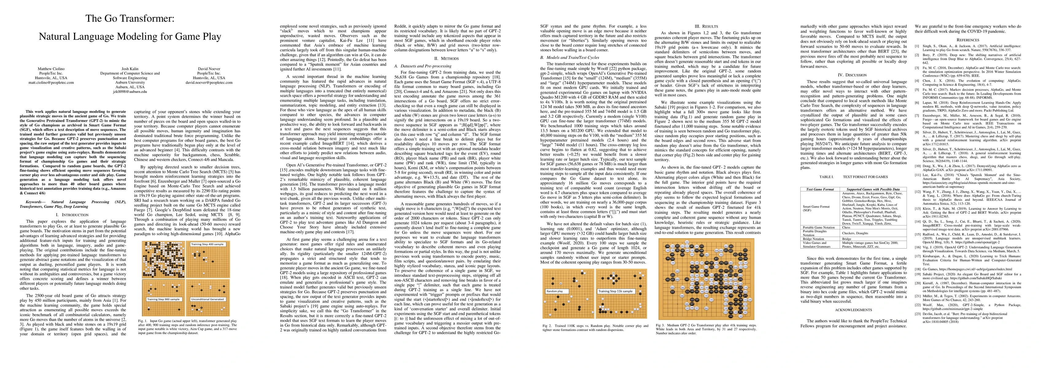 This paper trains GPT-2 on Go game data to generate strategic moves, demonstrating that language modeling can capture Go's strategic formations and favoring corner play. The model's output can be used for game visualization and suggests potential for similar applications in other board games.