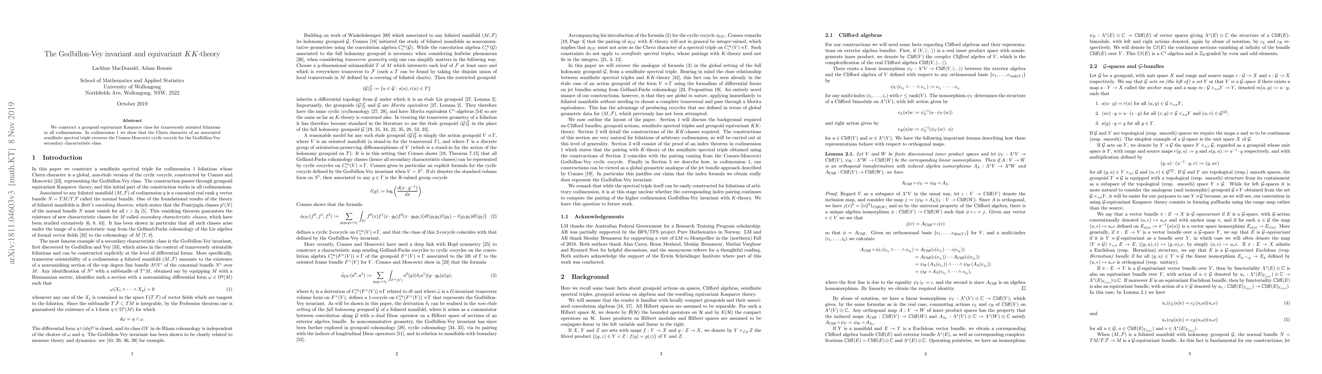 This paper constructs a groupoid equivariant Kasparov class for transversely oriented foliations in all codimensions, and shows that the Chern character of an associated spectral triple recovers the Connes-Moscovici cyclic cocycle for the Godbillon-Vey secondary characteristic class.