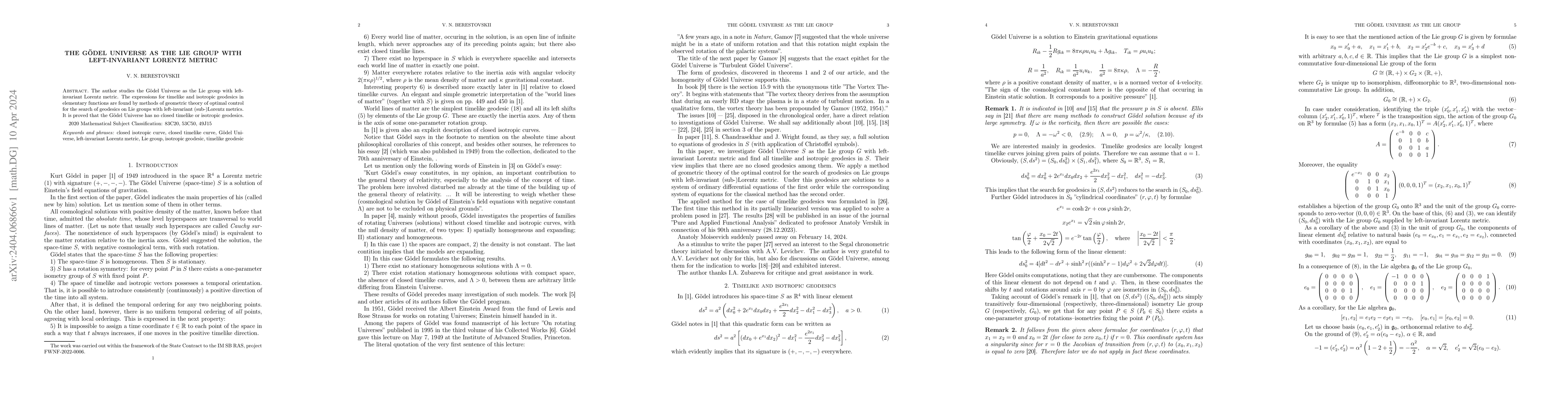 The paper explores the Gödel Universe as a Lie group with a left-invariant Lorentz metric, deriving expressions for timelike and isotropic geodesics using optimal control theory. It concludes that the Gödel Universe lacks closed timelike or isotropic geodesics.