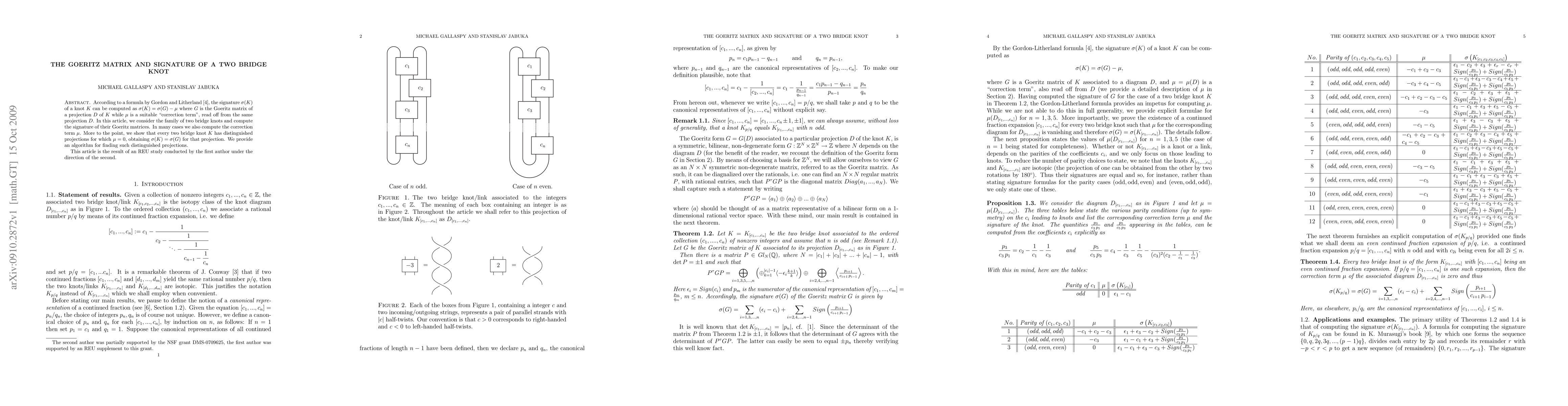 This paper computes the signature of two bridge knots K(p/q) using the Goeritz matrix formula, revealing that for certain "even continued fraction expansions" of p/q, the correction term vanishes, fully determining the knot's signature. An algorithm for identifying these expansions is also provided.