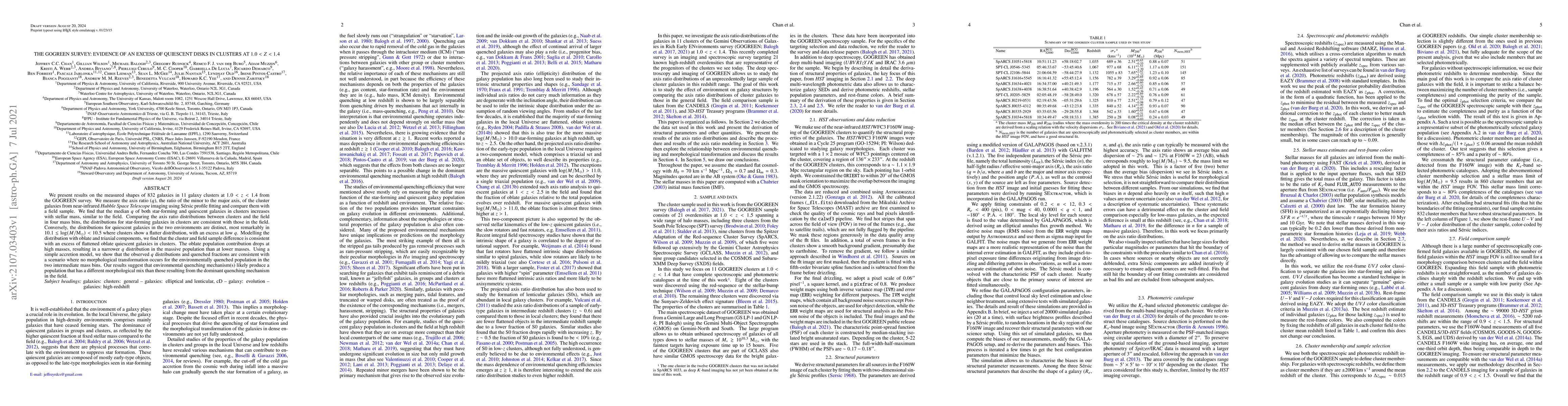 We present results on the measured shapes of 832 galaxies in 11 galaxy clusters at 1.0 < z <1.4 from the GOGREEN survey. We measure the axis ratio ($q$), the ratio of the minor to the major axis, of the cluster galaxies from near-infrared Hubble Space Telescope imaging using S\'ersic profile fitting and compare them with a field sample. We find that the median $q$ of both star-forming and quiescent galaxies in clusters increases with stellar mass, similar to the field. Comparing the axis ratio distributions between clusters and the field in four mass bins, the distributions for star-forming galaxies in clusters are consistent with those in the field. Conversely, the distributions for quiescent galaxies in the two environments are distinct, most remarkably in $10.1\leq\log(M/{\rm M}_{\odot})<10.5$ where clusters show a flatter distribution, with an excess at low $q$. Modelling the distribution with oblate and triaxial components, we find that the cluster and field sample difference is consistent with an excess of flattened oblate quiescent galaxies in clusters. The oblate population contribution drops at high masses, resulting in a narrower $q$ distribution in the massive population than at lower masses. Using a simple accretion model, we show that the observed $q$ distributions and quenched fractions are consistent with a scenario where no morphological transformation occurs for the environmentally quenched population in the two intermediate mass bins. Our results suggest that environmental quenching mechanism(s) likely produce a population that has a different morphological mix than those resulting from the dominant quenching mechanism in the field.