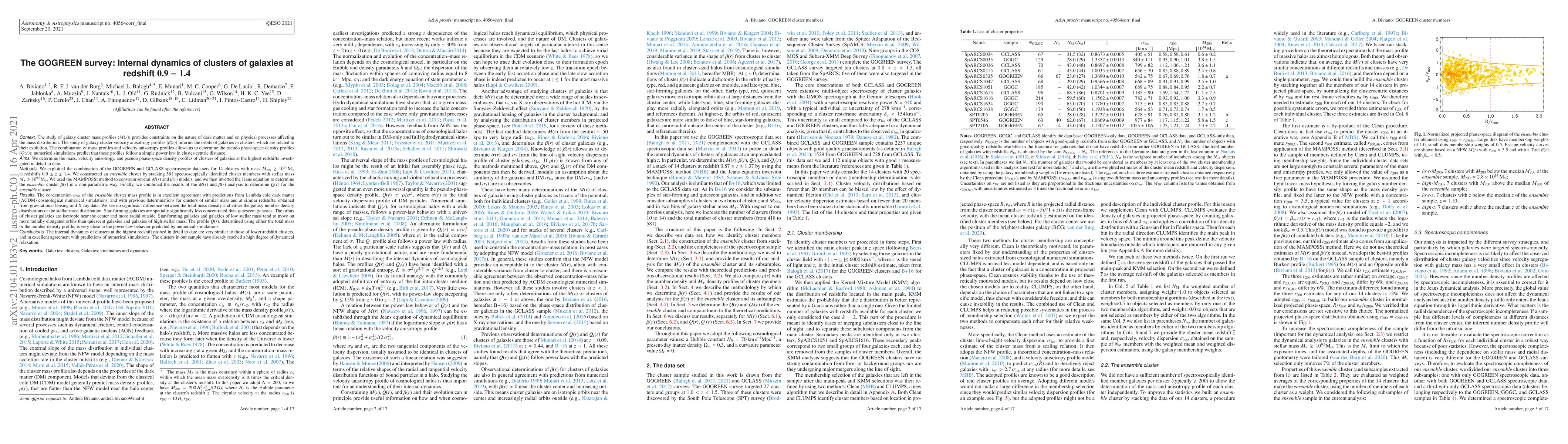 The GOGREEN survey analyzed 14 massive galaxy clusters at redshifts 0.9-1.4, finding their mass, velocity anisotropy, and phase-space density profiles. By stacking these clusters, they determined M(r), beta(r), and Q(r) using MAMPOSSt and Jeans equation inversion. Results align with LambdaCDM predictions and show no significant difference between total mass density and galaxy/stellar mass distributions. Star-forming galaxies are less concentrated, and their orbits are more radially elongated than quiescent galaxies. Internal dynamics resemble lower-redshift clusters, indicating high dynamical relaxation.