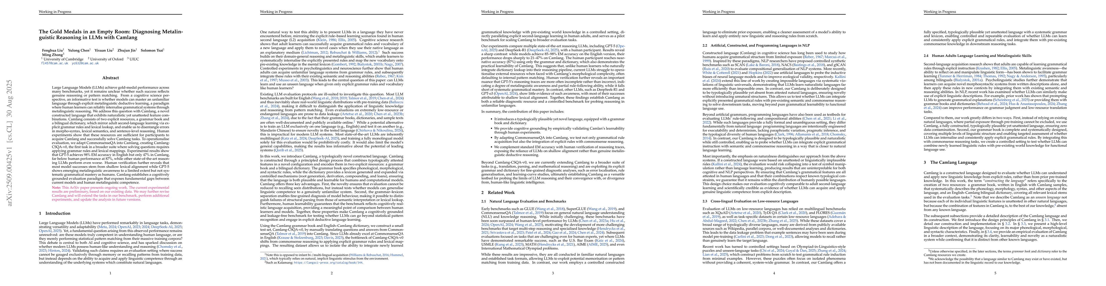 Large Language Models (LLMs) achieve gold-medal performance across many benchmarks, yet it remains unclear whether such success reflects genuine reasoning or pattern matching. From a cognitive science perspective, an informative test is whether models can master an unfamiliar language through explicit metalinguistic deductive learning, a paradigm where human learners can reliably internalise grammatical systems through metalinguistic reasoning. We address this question with Camlang, a novel constructed language that exhibits naturalistic yet unattested feature combinations. Camlang consists of two explicit resources, a grammar book and a bilingual dictionary, which mirror adult second-language learning via explicit grammar rules and lexical lookup, and enable us to disentangle errors in morpho-syntax, lexical semantics, and sentence-level reasoning. Human experiments show that these resources are sufficient for participants to acquire Camlang and successfully solve Camlang tasks. To operationalise evaluation, we adapt CommonsenseQA into Camlang, creating Camlang-CSQA-v0, the first task in a broader suite where solving questions requires applying grammar rules and lexical mappings. Experimental results show that GPT-5 achieves 98\% EM accuracy in English but only 47\% in Camlang, far below human performance at 87\%, while other state-of-the-art reasoning LLMs perform even worse. Human verification further reveals that most model successes stem from shallow lexical alignment while GPT-5 shows emerging metalinguistic awareness to a limited extent but not systematic grammatical mastery as humans. Camlang establishes a cognitively grounded evaluation paradigm that exposes fundamental gaps between current models and human metalinguistic competence.