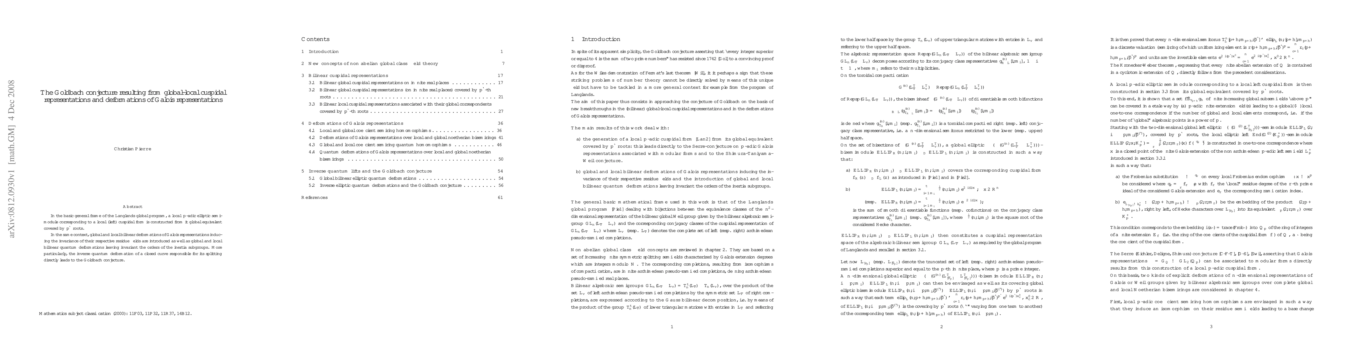 In the basic general frame of the Langlands global program, a local p-adic elliptic semimodule corresponding to a local (left) cuspidal form is constructed from its global equivalent covered by p-th roots. In the same context, global and local bilinear deformations of Galois representations inducing the invariance of their respective residue fields are introduced as well as global and local bilinear quantum deformations leaving invariant the orders of the inertia subgroups. More particularly, the inverse quantum deformation of a closed curve responsible for its splitting directly leads to the Goldbach conjecture.