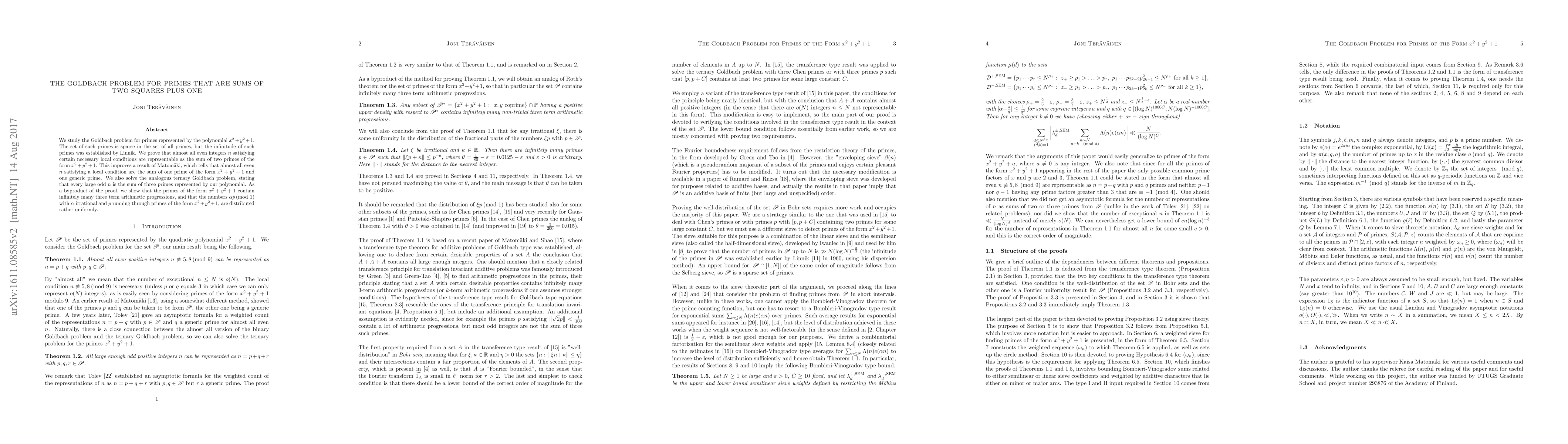This paper proves that almost all even integers can be expressed as the sum of two primes of the form $x^2+y^2+1$, improving upon a previous result. It also addresses the ternary Goldbach problem for large odd integers and demonstrates the uniform distribution of certain sequences involving these primes.