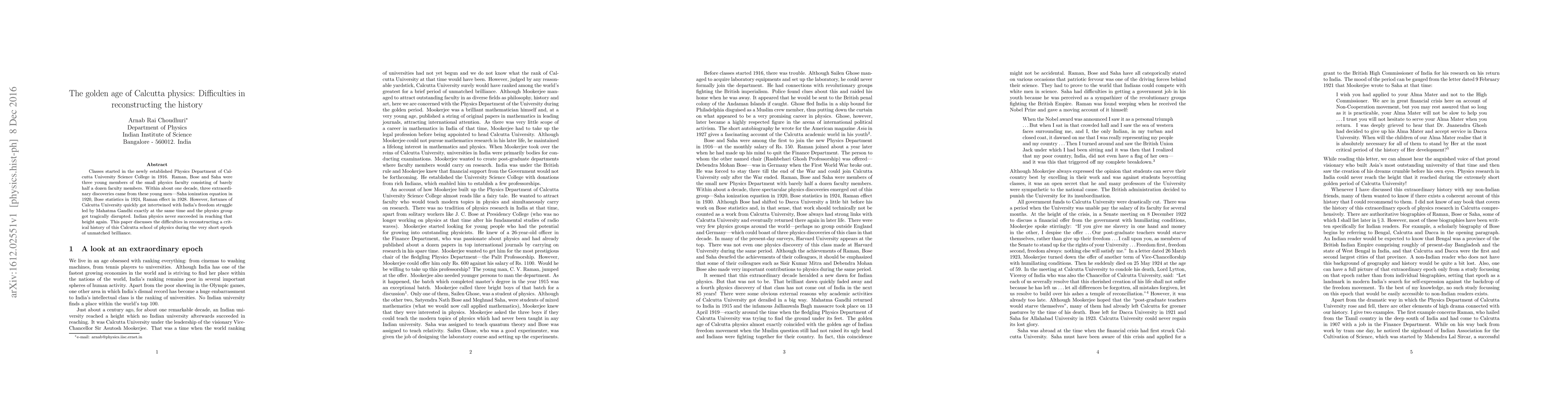 Classes started in the newly established Physics Department of Calcutta University Science College in 1916. Raman, Bose and Saha were three young members of the small physics faculty consisting of barely half a dozen faculty members. Within about one decade, three extraordinary discoveries came from these young men---Saha ionization equation in 1920, Bose statistics in 1924, Raman effect in 1928. However, fortunes of Calcutta University quickly got intertwined with India's freedom struggle led by Mahatma Gandhi exactly at the same time and the physics group got tragically disrupted. Indian physics never succeeded in reaching that height again. This paper discusses the difficulties in reconstructing a critical history of this Calcutta school of physics during the very short epoch of unmatched brilliance.