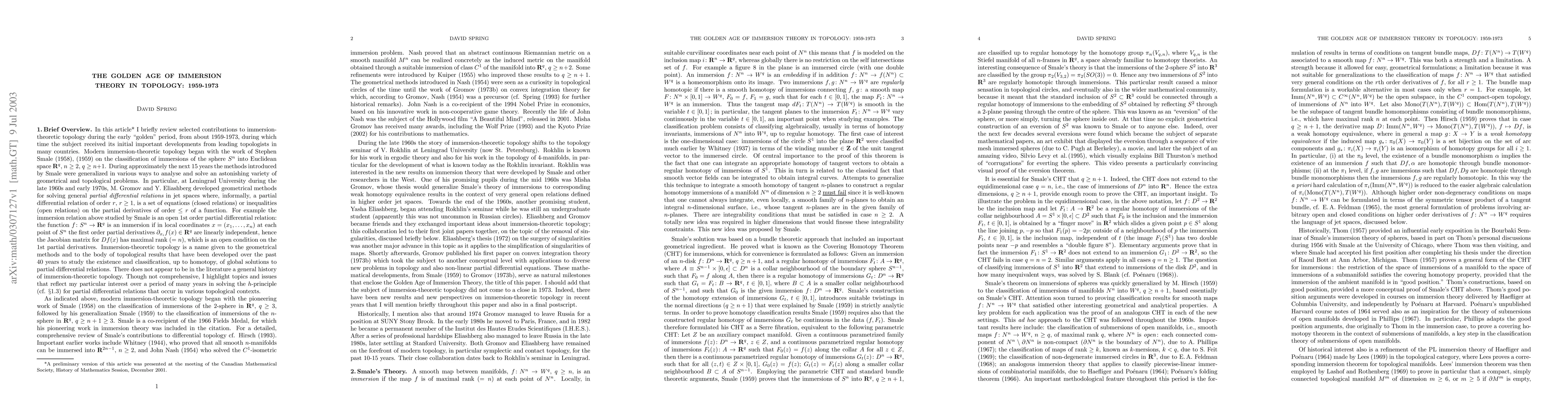 We briefly review selected contributions to immersion-theoretic topology, from S. Smale's immersion theory for spheres to M. Gromov's convex integration theory, during the early "golden" period from about 1959-1973. Historical remarks are included and technical concepts are presented informally.