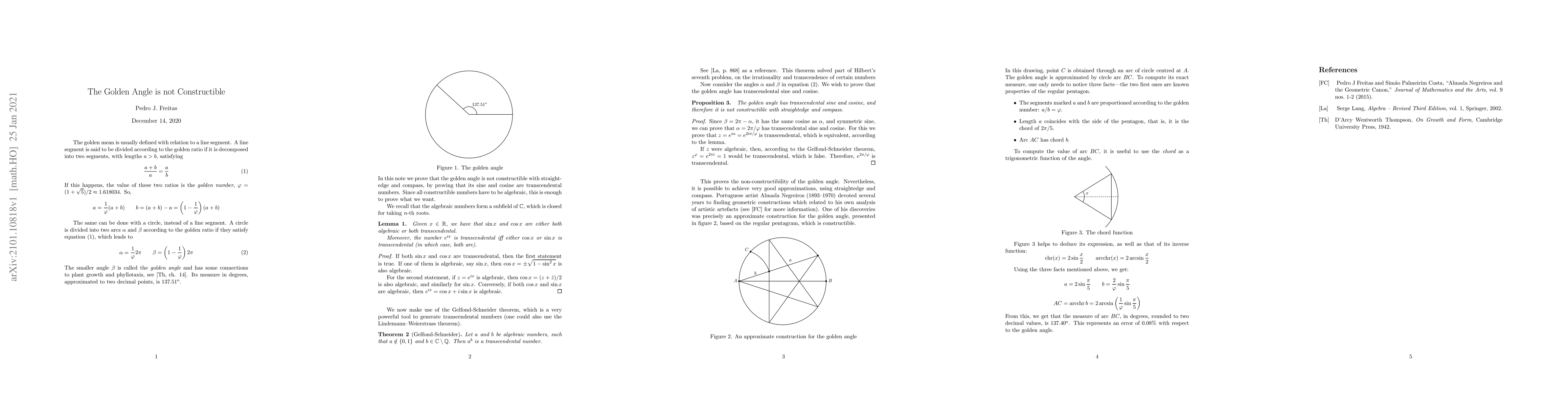 We prove that the golden angle (an angle that divides the circle in the golden ratio) is not constructible using straightedge and compass.