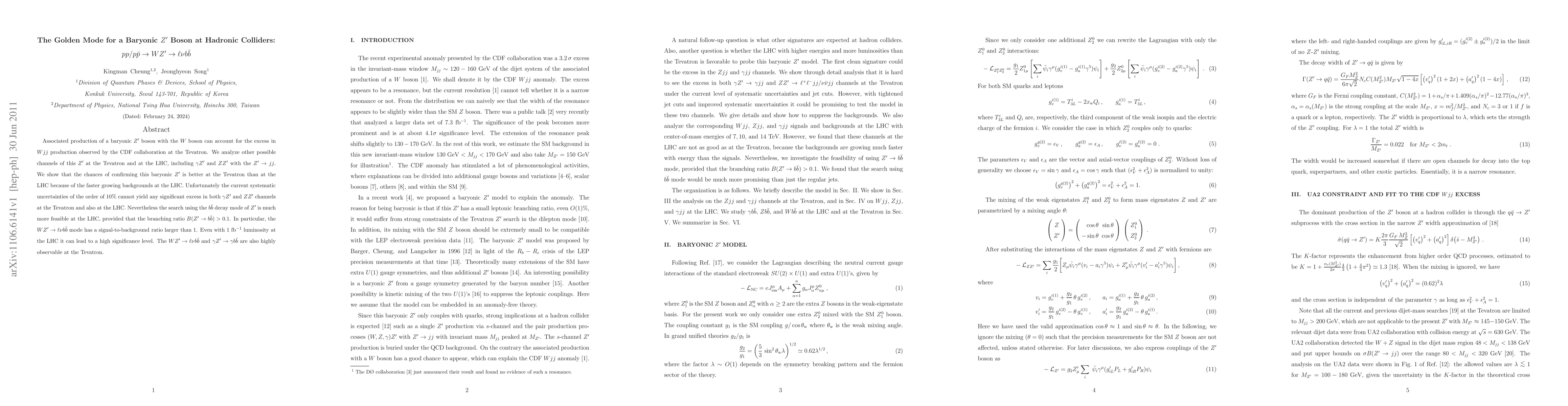 Associated production of a baryonic Z' boson with the W boson can account for the excess in Wjj production observed by the CDF collaboration at the Tevatron. We analyze other possible channels of this Z' at the Tevatron and at the LHC, including \gamma Z' and Z Z' with the Z' -> jj. We show that the chances of confirming this baryonic Z' is better at the Tevatron than at the LHC because of the faster growing backgrounds at the LHC. Unfortunately the current systematic uncertainties of the order of 10% cannot yield any significant excess in both \gamma Z' and Z Z' channels at the Tevatron and also at the LHC. Nevertheless the search using the b\bar b decay mode of Z' is much more feasible at the LHC, provided that the branching ratio B(Z' -> b\bar b) > 0.1. In particular, the W Z' -> l \nu b\bar b mode has a signal-to-background ratio larger than 1. Even with 1 fb^{-1} luminosity at the LHC it can lead to a high significance level. The WZ' -> l \nu b \bar b and \gamma Z' -> \gamma b \bar b are also highly observable at the Tevatron.