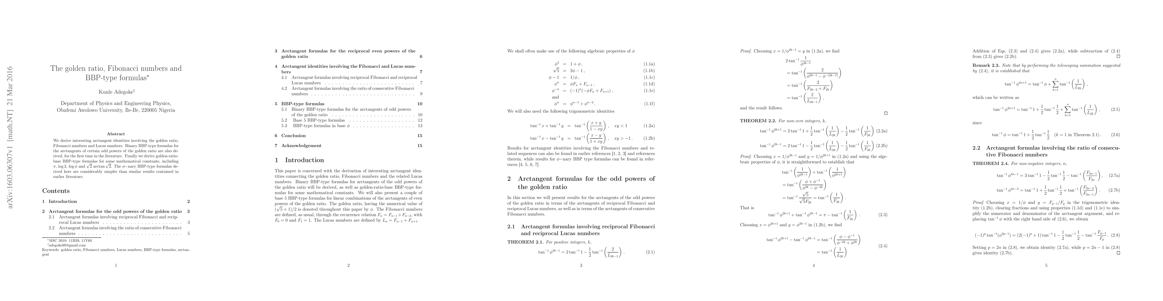 The paper derives new arctangent identities and Binary BBP-type formulas involving the golden ratio, Fibonacci numbers, and Lucas numbers, including simplified $\phi$-nary BBP-type formulas for constants like $\pi$, $\log 2$, $\log\phi$, and $\sqrt 2\,\arctan\sqrt 2$.
