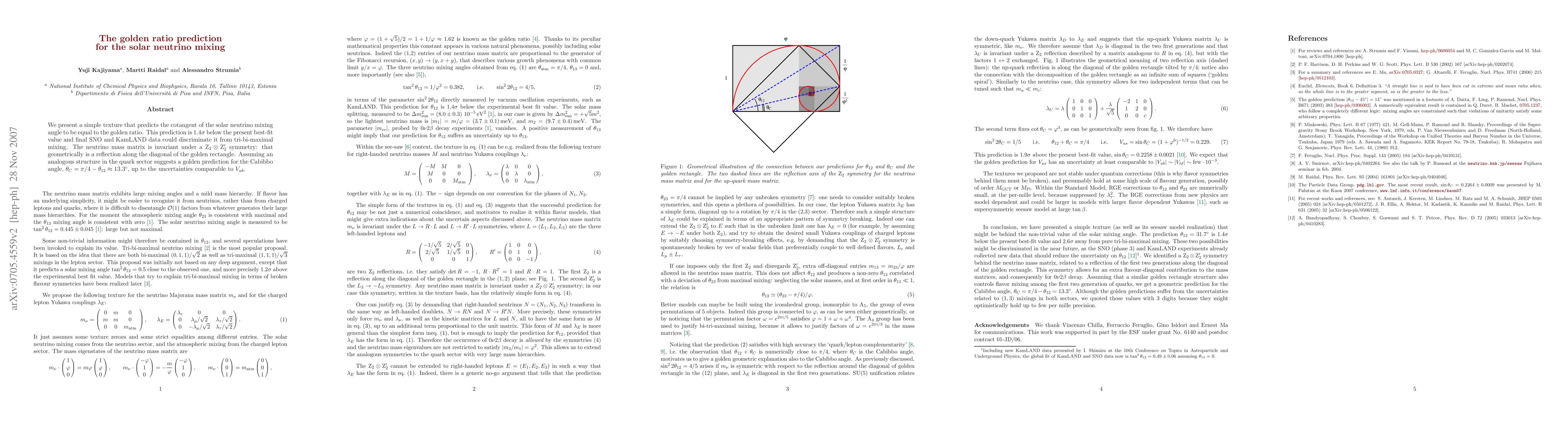 The paper proposes a simple texture in neutrino mixing that predicts the cotangent of the solar mixing angle to equal the golden ratio, a prediction that is currently below experimental measurements. It also suggests a similar structure for quarks could lead to a golden prediction for the Cabibbo angle.