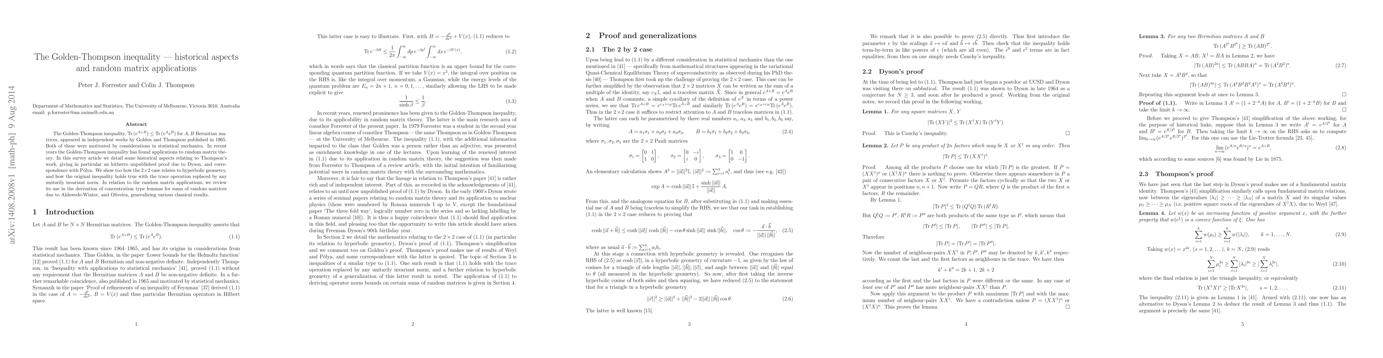 This paper surveys the historical development of the Golden-Thompson inequality, including unpublished proofs and correspondence, and explores its applications in random matrix theory, particularly in deriving concentration lemmas for sums of random matrices.