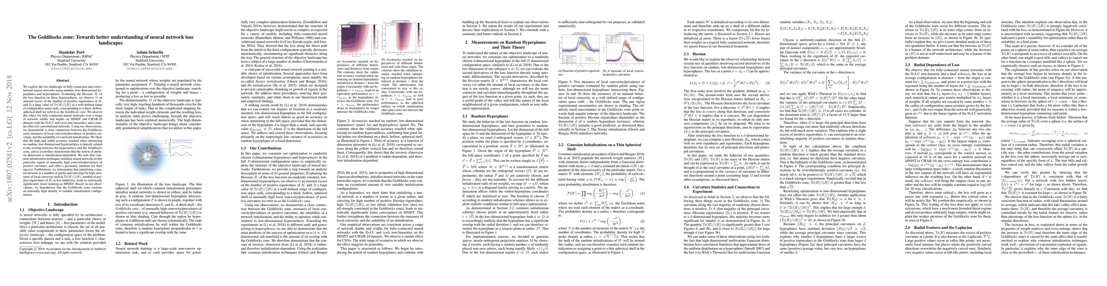 We explore the loss landscape of fully-connected and convolutional neural networks using random, low-dimensional hyperplanes and hyperspheres. Evaluating the Hessian, $H$, of the loss function on these hypersurfaces, we observe 1) an unusual excess of the number of positive eigenvalues of $H$, and 2) a large value of $\mathrm{Tr}(H) / ||H||$ at a well defined range of configuration space radii, corresponding to a thick, hollow, spherical shell we refer to as the \textit{Goldilocks zone}. We observe this effect for fully-connected neural networks over a range of network widths and depths on MNIST and CIFAR-10 datasets with the $\mathrm{ReLU}$ and $\tanh$ non-linearities, and a similar effect for convolutional networks. Using our observations, we demonstrate a close connection between the Goldilocks zone, measures of local convexity/prevalence of positive curvature, and the suitability of a network initialization. We show that the high and stable accuracy reached when optimizing on random, low-dimensional hypersurfaces is directly related to the overlap between the hypersurface and the Goldilocks zone, and as a corollary demonstrate that the notion of intrinsic dimension is initialization-dependent. We note that common initialization techniques initialize neural networks in this particular region of unusually high convexity/prevalence of positive curvature, and offer a geometric intuition for their success. Furthermore, we demonstrate that initializing a neural network at a number of points and selecting for high measures of local convexity such as $\mathrm{Tr}(H) / ||H||$, number of positive eigenvalues of $H$, or low initial loss, leads to statistically significantly faster training on MNIST. Based on our observations, we hypothesize that the Goldilocks zone contains an unusually high density of suitable initialization configurations.