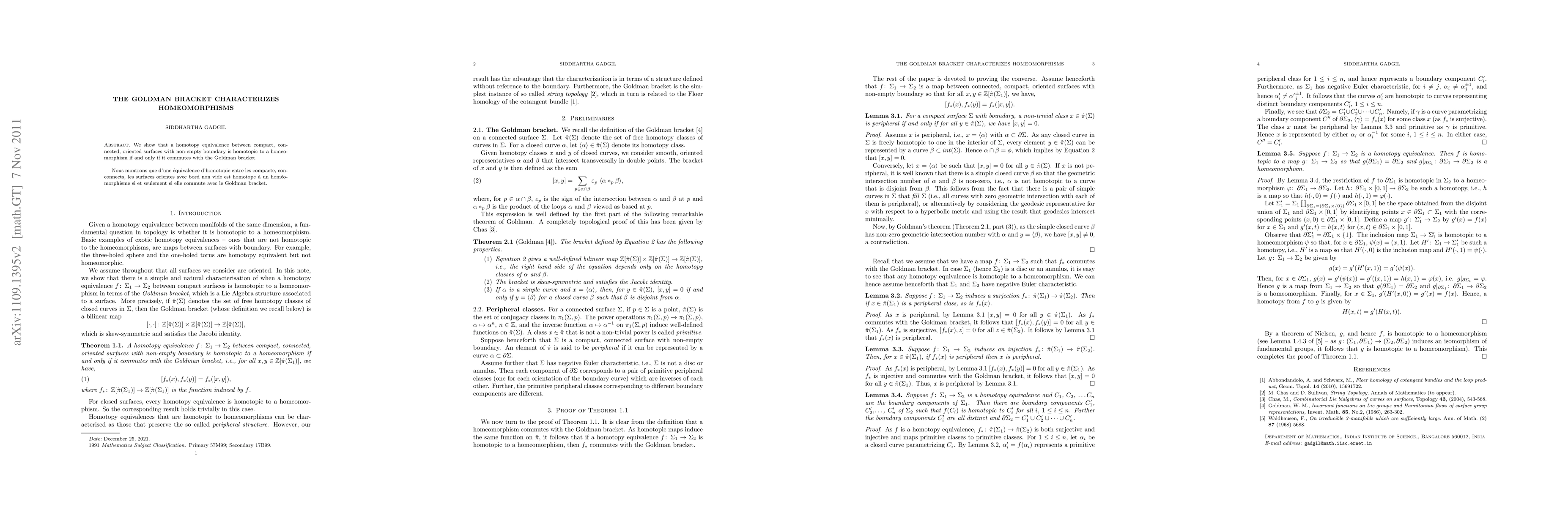 Summary: The Goldman bracket characterizes when homotopy equivalences between compact, connected, oriented surfaces with non-empty boundaries are homotopic to homeomorphisms. Specifically, such equivalences are homeomorphic if and only if they respect the Goldman bracket.