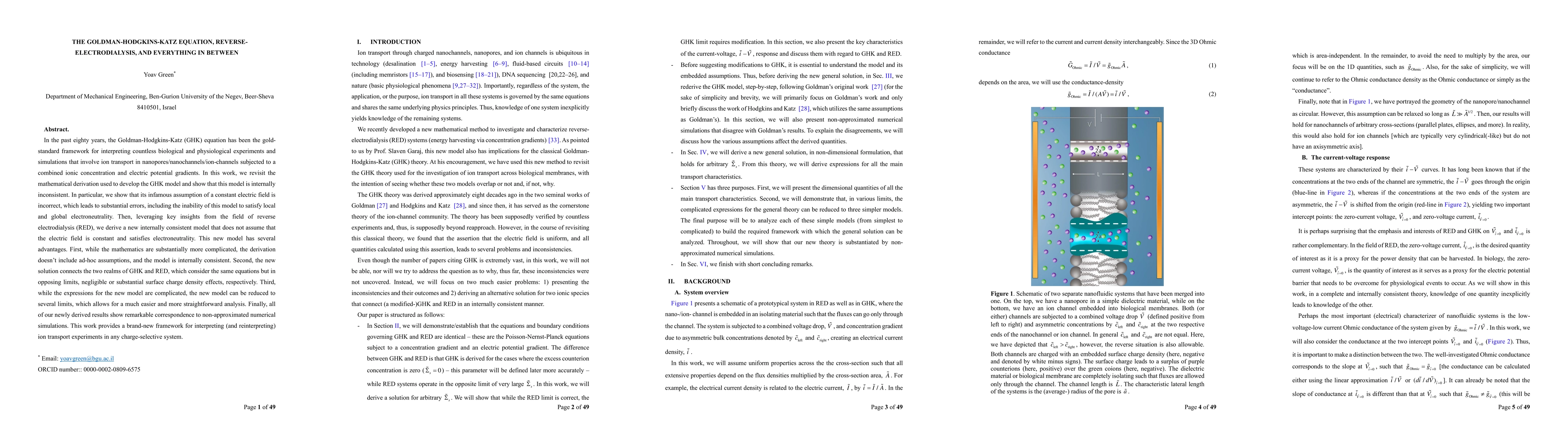 In the past eighty years, the Goldman-Hodgkins-Katz (GHK) equation has been the gold-standard framework for interpreting countless biological and physiological experiments and simulations that involve ion transport in nanopores/nanochannels/ion-channels subjected to a combined ionic concentration and electric potential gradients. In this work, we revisit the mathematical derivation used to develop the GHK model and show that this model is internally inconsistent. In particular, we show that its infamous assumption of a constant electric field is incorrect, which leads to substantial errors, including the inability of this model to satisfy local and global electroneutrality. Then, leveraging key insights from the field of reverse electrodialysis (RED), we derive a new internally consistent model that does not assume that the electric field is constant and satisfies electroneutrality. This new model has several advantages. First, while the mathematics are substantially more complicated, the derivation does not include ad-hoc assumptions, and the model is internally consistent. Second, the new solution connects the two realms of GHK and RED, which consider the same equations but in opposing limits, negligible or substantial surface charge density effects, respectively. Third, while the expressions for the new model are complicated, the new model can be reduced to several limits, which allows for a much easier and more straightforward analysis. Finally, all of our newly derived results show remarkable correspondence to non-approximated numerical simulations. This work provides a brand-new framework for interpreting (and reinterpreting) ion transport experiments in any charge-selective system.