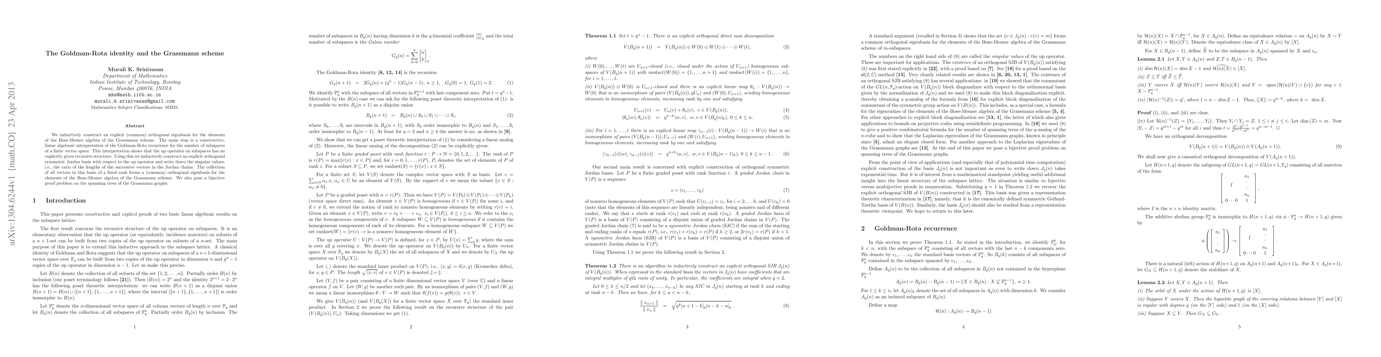 We inductively construct an explicit (common) orthogonal eigenbasis for the elements of the Bose-Mesner algebra of the Grassmann scheme. The main step is a constructive, linear algebraic interpretation of the Goldman-Rota recurrence for the number of subspaces of a finite vector space. This interpretation shows that the up operator on subspaces has an explicitly given recursive structure. Using this we inductively construct an explicit orthogonal symmetric Jordan basis with respect to the up operator and write down the singular values, i.e., the ratio of the lengths of the successive vectors in the Jordan chains. The collection of all vectors in this basis of a fixed rank forms a (common) orthogonal eigenbasis for the elements of the Bose-Mesner algebra of the Grassmann scheme. We also pose a bijective proof problem on the spanning trees of the Grassmann graphs.