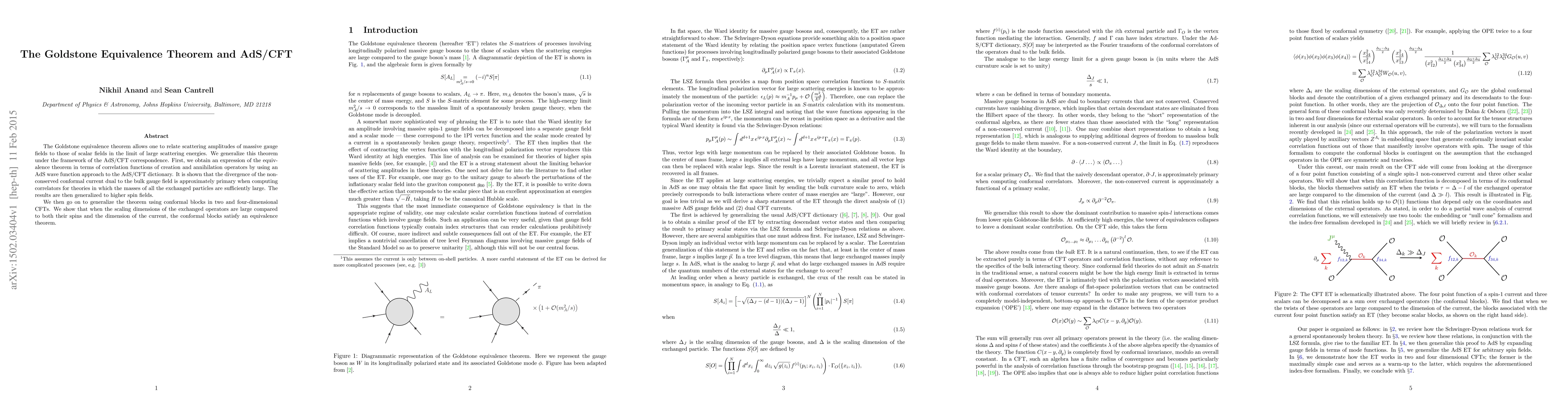 The Goldstone equivalence theorem is extended to the AdS/CFT framework, showing that scattering amplitudes of massive gauge fields relate to those of scalar fields at high energies. The theorem is generalized using conformal blocks in CFTs, demonstrating equivalence when exchanged operators' scaling dimensions are large relative to their spins and the current's dimension.