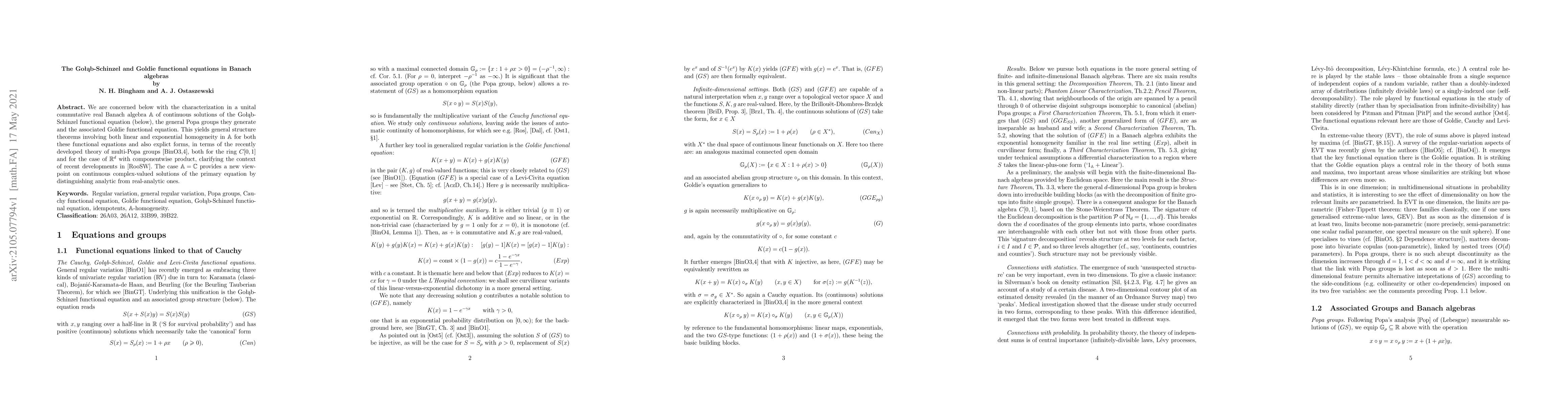 We are concerned below with the characterization in a unital commutative real Banach algebra $\mathbb{A}$ of continuous solutions of the Go{\l}\k{a}b-Schinzel functional equation (below), the general Popa groups they generate and the associated Goldie functional equation. This yields general structure theorems involving both linear and exponential homogeneity in $\mathbb{A}$ for both these functional equations and also explict forms, in terms of the recently developed theory of multi-Popa groups [BinO3,4], both for the ring $C[0,1]$ and for the case of $\mathbb{R}^{d}$ with componentwise product, clarifying the context of recent developments in [RooSW]. The case $\mathbb{A}=\mathbb{C}$ provides a new viewpoint on continuous complex-valued solutions of the primary equation by distinguishing analytic from real-analytic ones.