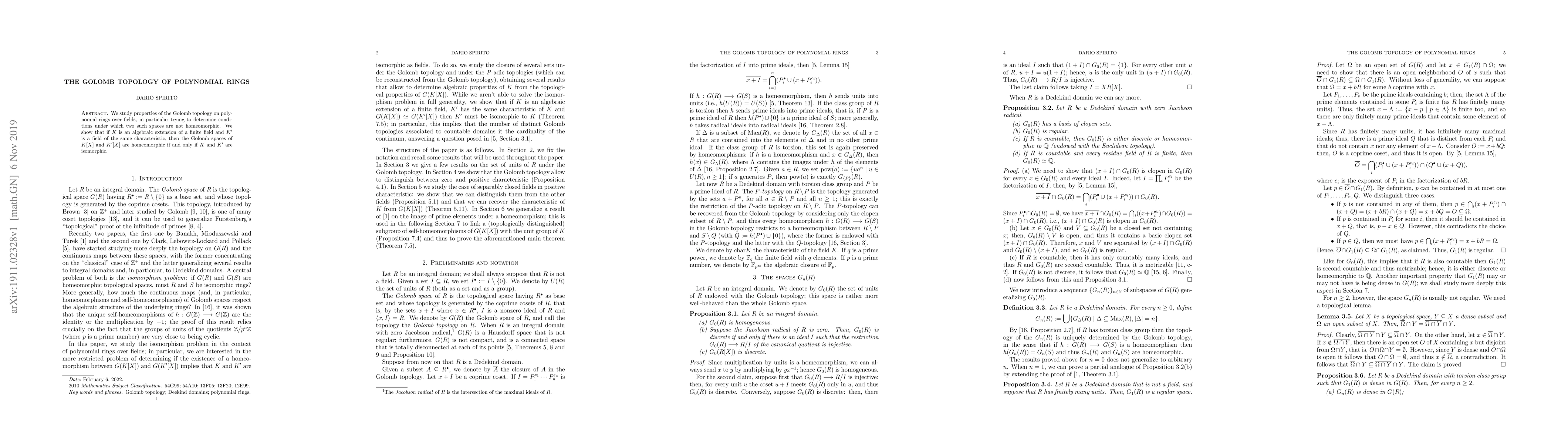 Summary: This paper investigates the Golomb topology on polynomial rings over fields, focusing on determining when two such spaces are not homeomorphic. It concludes that the Golomb spaces of polynomial rings over algebraic extensions of finite fields are homeomorphic if and only if the fields themselves are isomorphic.