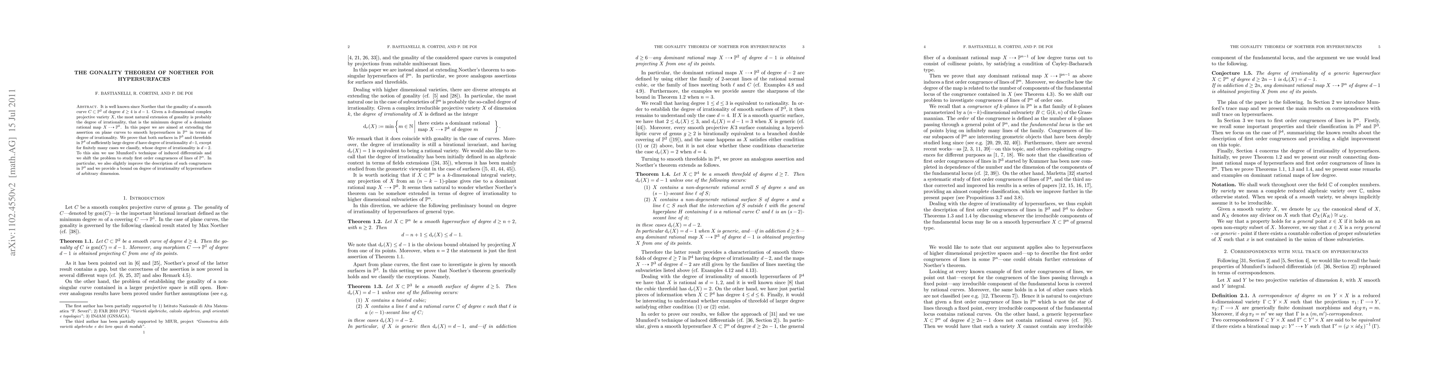 This paper extends Noether's gonality theorem to smooth hypersurfaces in projective spaces, proving that sufficiently large degree hypersurfaces in $\mathbb{P}^3$ and $\mathbb{P}^4$ have degree of irrationality d-1, except for a few cases where it is d-2. The authors use Mumford's differential technique and study first-order congruences of lines.