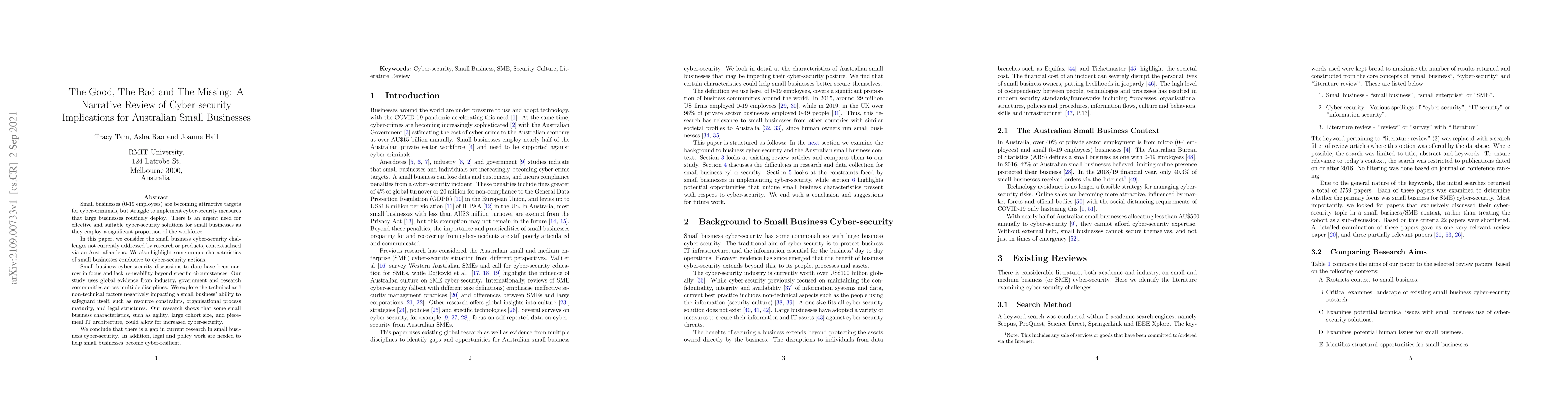 This paper reviews the unique cyber-security challenges faced by Australian small businesses, highlighting the lack of effective solutions and the need for tailored approaches. It identifies gaps in current research and emphasizes the necessity for legal and policy frameworks to enhance small business cyber-resilience.
