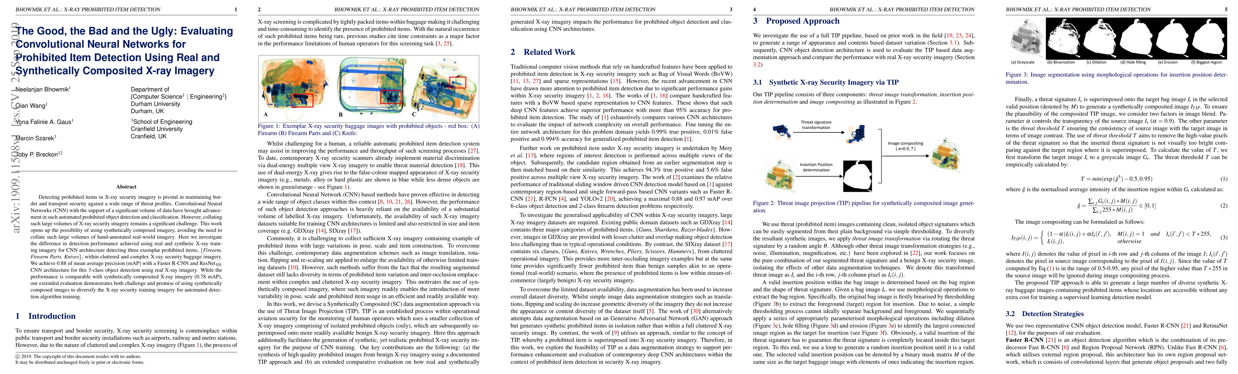 This paper evaluates the use of Convolutional Neural Networks (CNNs) for detecting prohibited items in X-ray security imagery, comparing real and synthetically composited data. The study finds that while real imagery achieves higher detection performance (0.88 mean average precision), synthetic imagery (0.78 mAP) shows potential for training diversified detection algorithms.
