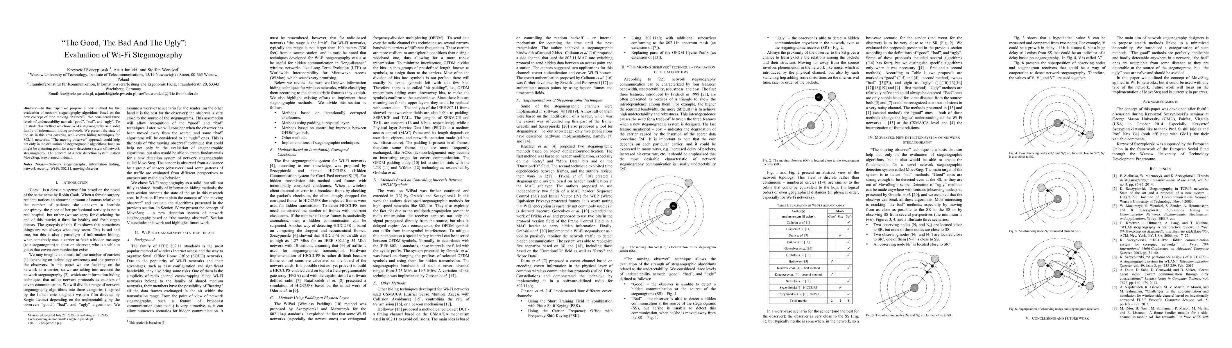 This paper introduces a novel "moving observer" method to evaluate Wi-Fi steganography algorithms, categorizing them into "good", "bad", and "ugly" based on undetectability. It also proposes a new detection system, MoveSteg, for identifying network steganography.