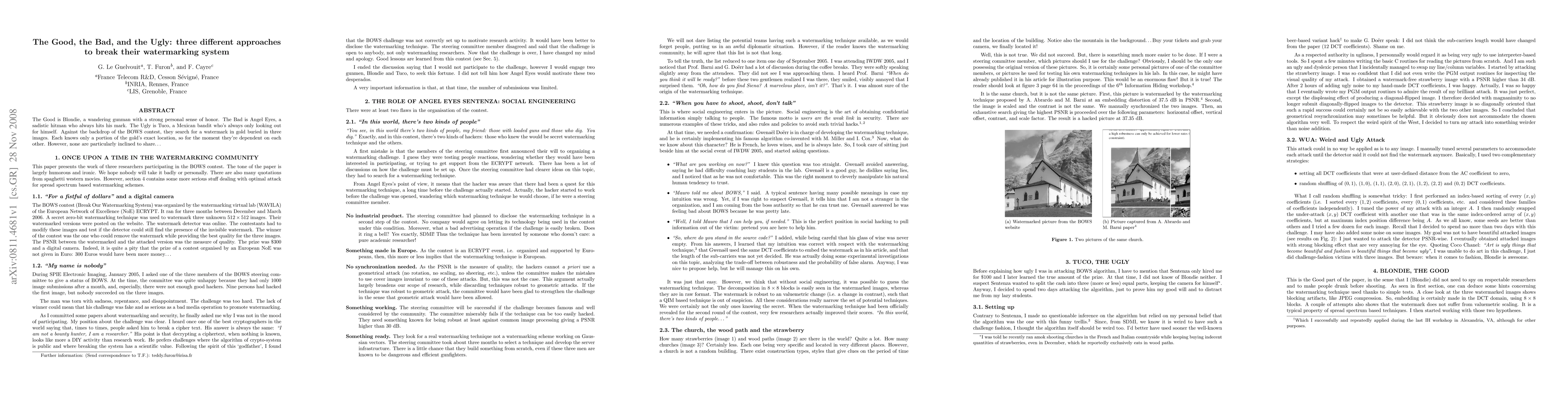 This paper explores three distinct strategies—Blondie, Angel Eyes, and Tuco—to break a watermarking system in the context of the BOWS contest. Each strategy represents a different approach to uncovering hidden information, with each "character" relying on partial knowledge while reluctant to cooperate.