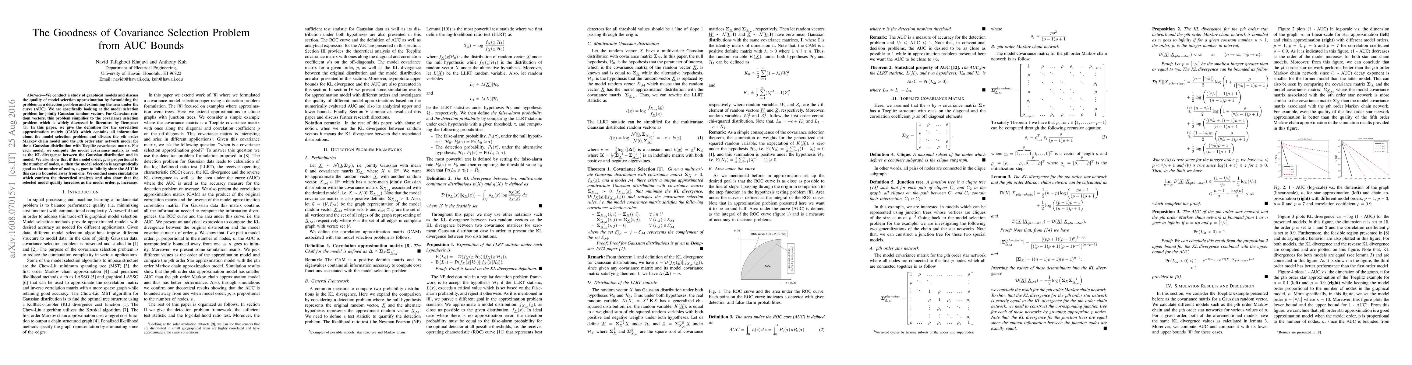 We conduct a study of graphical models and discuss the quality of model selection approximation by formulating the problem as a detection problem and examining the area under the curve (AUC). We are specifically looking at the model selection problem for jointly Gaussian random vectors. For Gaussian random vectors, this problem simplifies to the covariance selection problem which is widely discussed in literature by Dempster [1]. In this paper, we give the definition for the correlation approximation matrix (CAM) which contains all information about the model selection problem and discuss the pth order Markov chain model and the $p$th order star network model for the a Gaussian distribution with Toeplitz covariance matrix. For each model, we compute the model covariance matrix as well as the KL divergence between the Gaussian distribution and its model. We also show that if the model order, p, is proportional to the number of nodes, n, then the model selection is asymptotically good as the number of nodes, n, goes to infinity since the AUC in this case is bounded away from one. We conduct some simulations which confirm the theoretical analysis and also show that the selected model quality increases as the model order, p, increases.