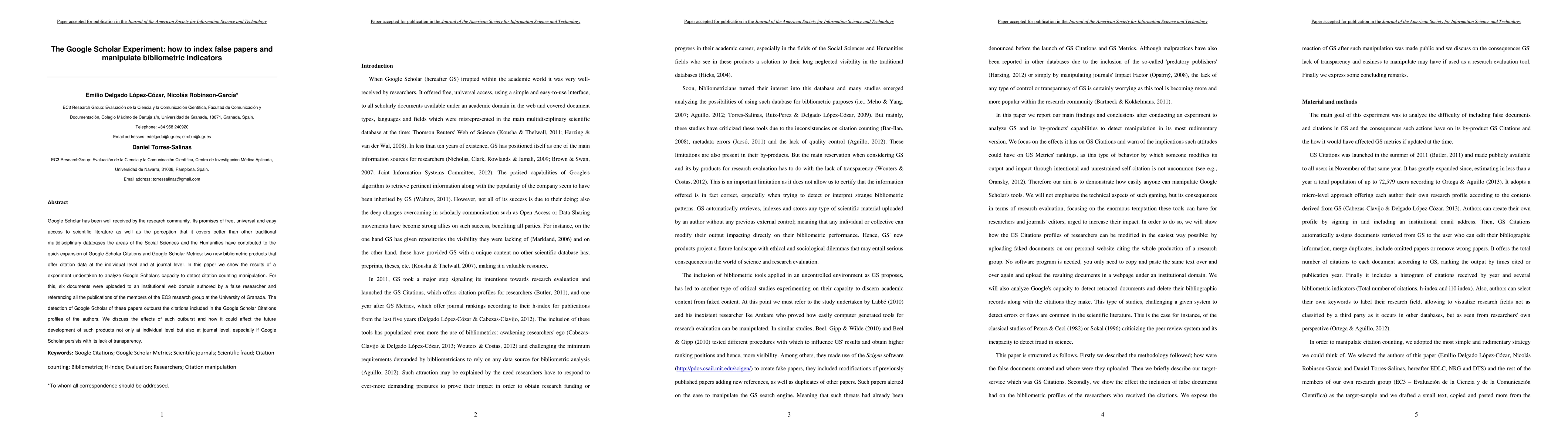This paper details an experiment where false papers were indexed on Google Scholar to manipulate bibliometric indicators, revealing the platform's vulnerability to citation counting manipulation. The study highlights the potential negative impacts on both individual and journal-level metrics, emphasizing the need for greater transparency in bibliometric products.