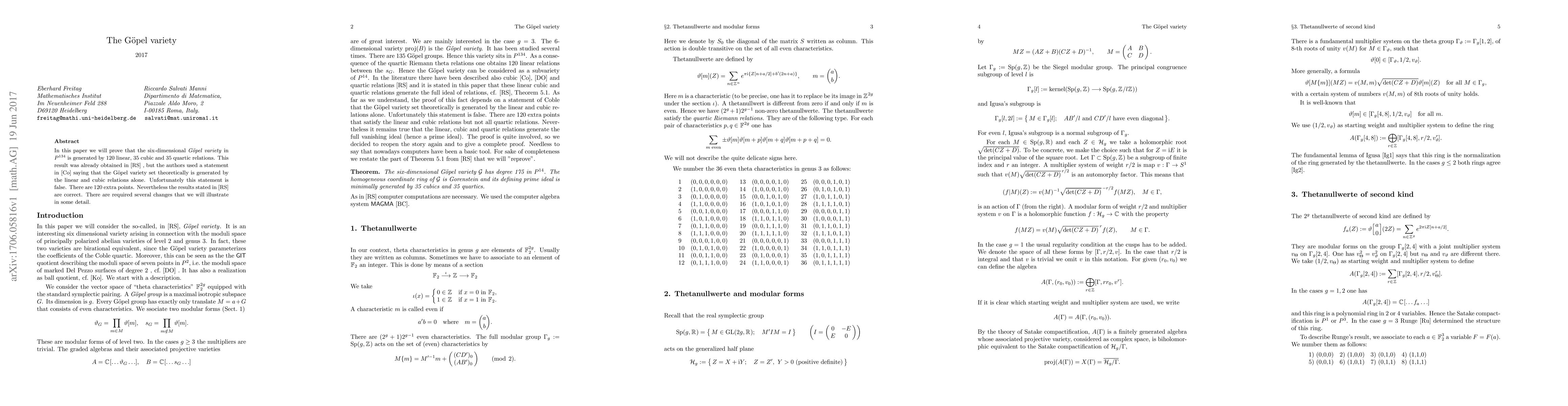 In this paper we will prove that the six-dimensional G\"opel variety in $P^{134}$ is generated by 120 linear, 35 cubic and 35 quartic relations. This result was already obtained in [RS] , but the authors used a statement in [Co] saying that the G\"opel variety set theoretically is generated by the linear and cubic relations alone. Unfortunately this statement is false. There are 120 extra points. Nevertheless the results stated in [RS] are correct. There are required several changes that we will illustrate in some detail